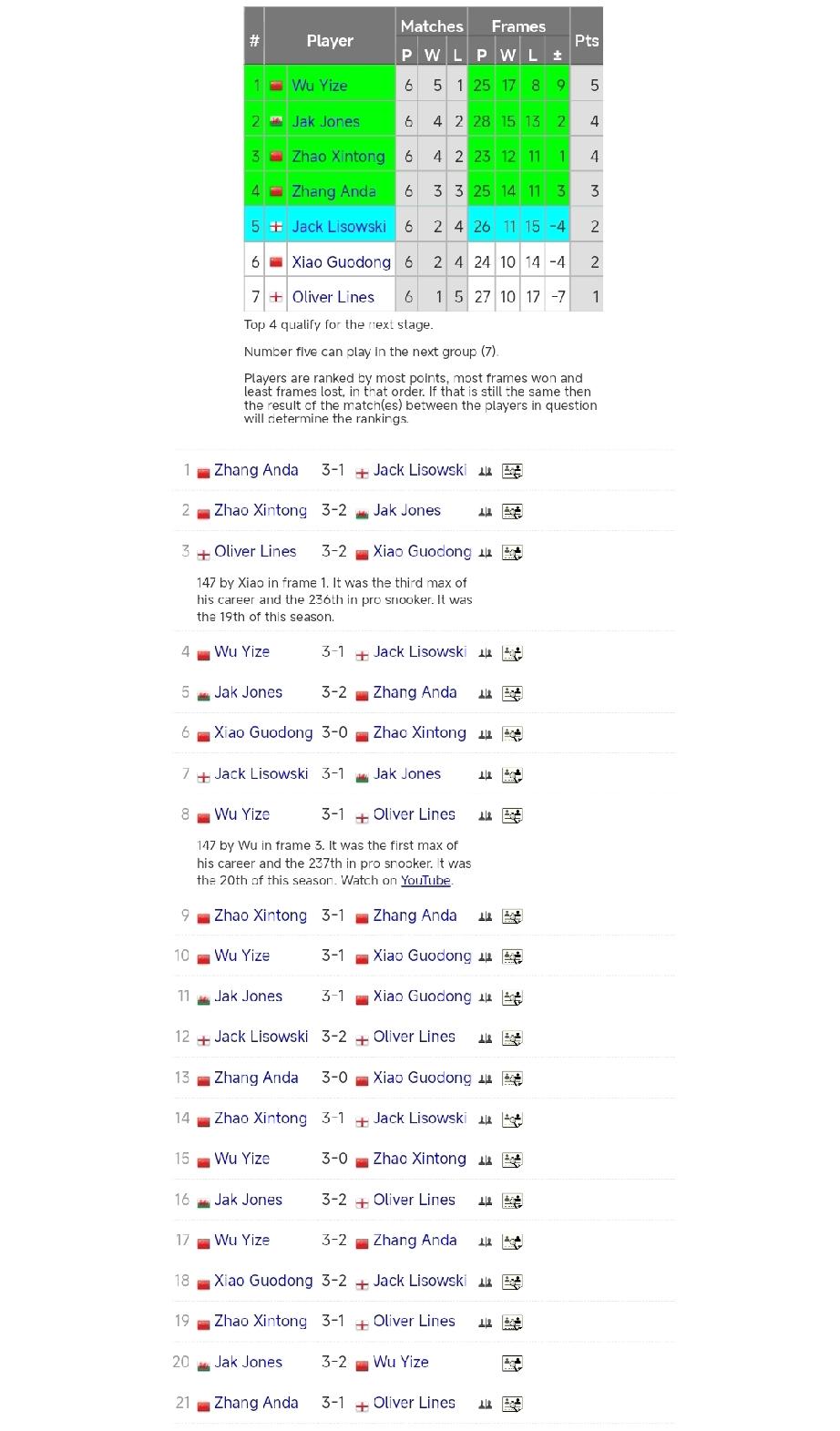 吴宜泽五胜一负最终位列小组第一! 1月23日,斯诺克冠军联赛第六小组循环赛结束,经过21场的争夺,吴宜泽夺得小组第一。他战胜了除杰克·琼斯以外的五个对手,2-3不敌杰克·琼斯。在对阵莱恩斯的时候,打出生涯第一杆147! 杰克·琼斯、赵心童、张安达名列2-4位,晋级小组半决赛。第五名杰克·利索夫斯基进入第七小组。 肖国栋二胜四负位列第六被淘汰。
