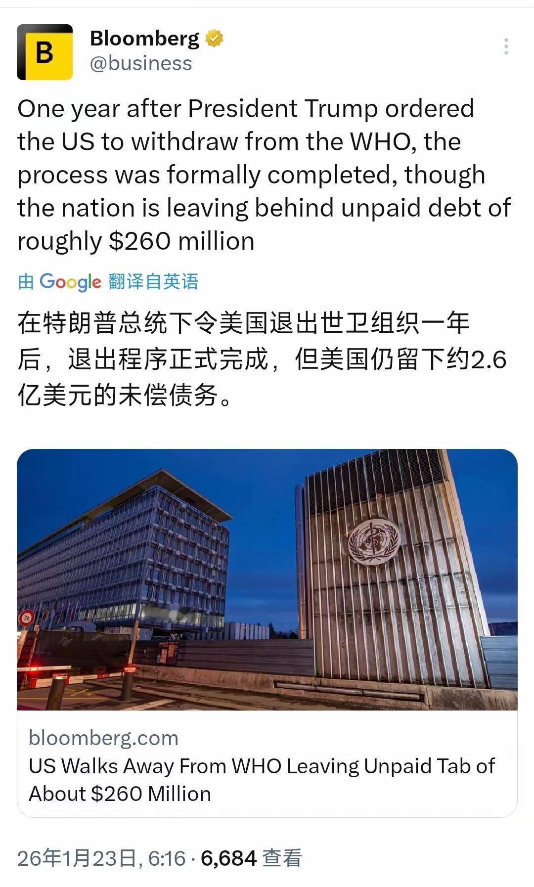 外媒报道:“在特朗普总统下令美国退出世卫组织一年后,退出程序正式完成,但美国仍留下约2.6亿美元的未偿债务。” 世卫组织可以启动对美国德特里克堡,新冠溯源等调查了!长久以来,美国作为大国,本应在全球卫生事务中担当责任,却退出世卫组织,还拖欠巨额债务,这是对国际公共卫生合作的公然挑衅。 美国德特里克堡生物实验室神秘可疑,诸多线索指向其或藏不可告人秘密。此前,美官方对该实验室突然关闭遮遮掩掩,未给出信服解释,周边还出现过类似新冠的不明呼吸疾病。 美国完成退出世卫组织程序,反倒扫除调查阻碍。新冠溯源关乎全球卫生安全,若世卫组织调查德特里克堡,或揭开病毒起源真相,让美国为其不透明行为和消极抗疫负责。 期待世卫组织公正科学调查,给世界交代。