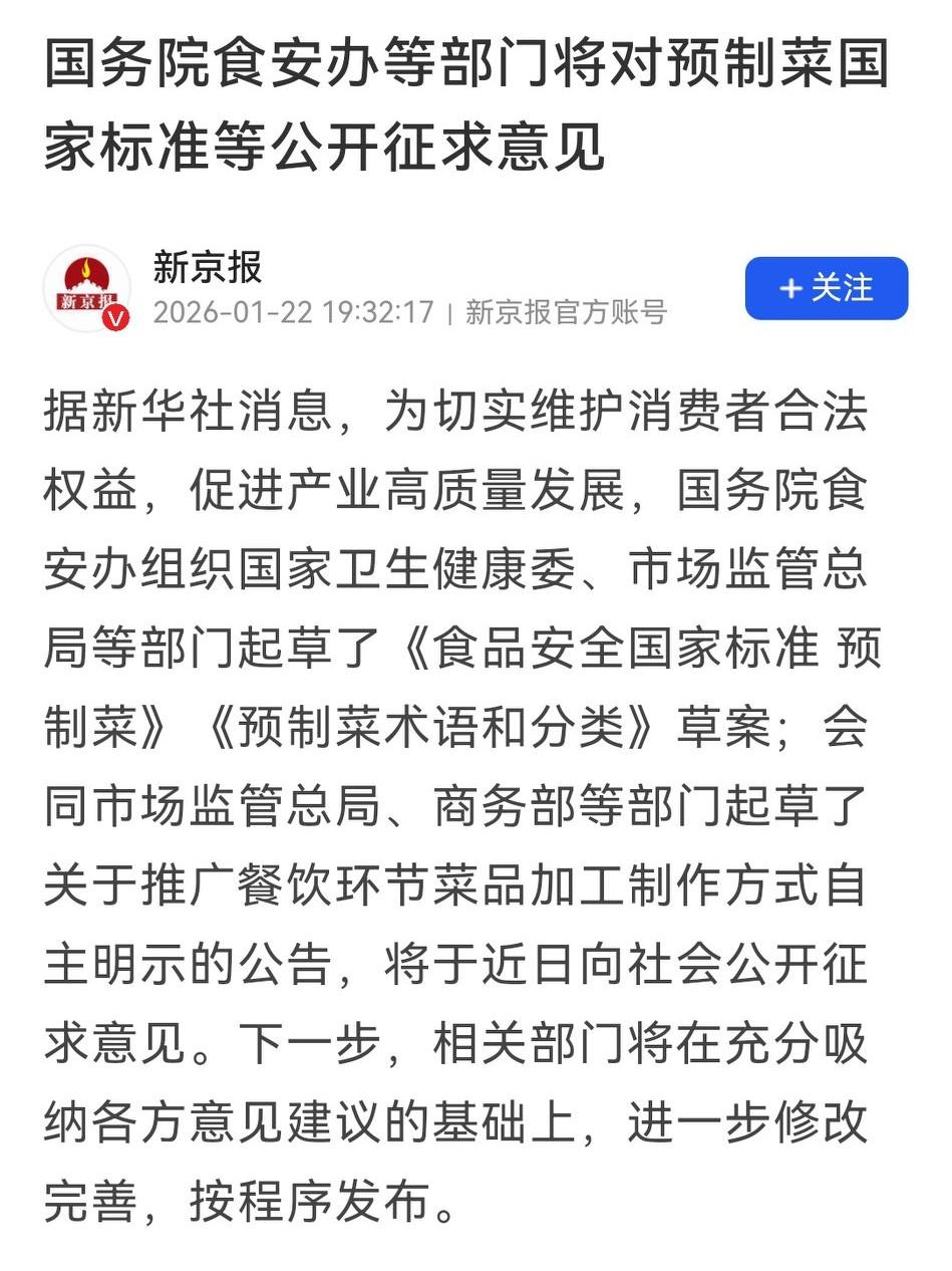预制菜国家标准落地!点外卖、下馆子,终于能看清你吃的是什么了 西贝超百家门店骤然关停,罗永浩吐槽半年的预制菜乱象,终于迎来了官方定调! 1月22日,国务院食安办重磅发布预制菜国家标准草案,从今天起,餐饮行业“遮遮掩掩用预制菜、高价卖料理包”的潜规则,彻底走到头了,亿万消费者的餐桌,终于要迎来明明白白的消费时代! 西贝关店不是终点,而是行业洗牌的起点 去年9月,罗永浩一句“西贝几乎全是预制菜还卖那么贵”的吐槽,瞬间撕开了餐饮行业的遮羞布。 消费者这才发现,自己花几十上百块点的外卖、下的馆子,可能只是加热后的料理包,而商家却始终对此避而不谈。 这场争议发酵半年,西贝的大规模关店成了压垮行业模糊经营的最后一根稻草。 这背后藏着最直白的消费逻辑:消费者可以接受预制菜,但绝不接受“被蒙骗”;可以为品质买单,但绝不甘心为信息差付费。 西贝的跌落,不是单个品牌的失败,而是整个餐饮行业的一次警钟——靠隐瞒和忽悠的生意,终究做不长久。 国家标准落地,三大改变重塑餐饮生态 此次公开征求意见的预制菜国家标准,不是一纸空文,而是直击行业痛点的“硬规矩”,从消费者、餐饮企业到预制菜产业,都将迎来颠覆性改变,每一个都关乎你的日常吃饭 消费者彻底告别“猜菜”,知情权实打实落地 新规明确要求,不管是堂食菜单还是外卖页面,只要菜品用到预制菜,必须在显眼位置清晰标注,同时配料表、生产日期、保质期、储存条件等信息也要一目了然。 以后下馆子、点外卖,不用再反复追问“是不是现炒”,不用再为“高价预制菜”踩坑,每一分钱花在哪,都能看得明明白白,有健康需求的朋友,也能通过配料表精准避坑,选到适合自己的菜品。 餐饮企业迎来生死洗牌,伪现炒彻底无路可走 标准落地后,餐饮企业的合规成本必然上升,菜单更新、标识整改、供应链梳理,每一项都考验着商家的实力。 那些靠低价预制菜冒充现炒、靠信息差赚差价的中小商家,要么回归现炒本心,要么直面利润压缩,没有第三条路可选;而拥有稳定供应链、规范中央厨房的连锁品牌,会凭借合规优势进一步抢占市场。 这场洗牌,洗的是浑水摸鱼的投机者,留下的是真正懂经营、守规则的实干者。 预制菜产业告别野蛮生长,走向规范高端化 过去几年,预制菜行业借着餐饮升级的风口快速扩张,但小作坊式生产、违规添加剂、品类界定模糊等问题层出不穷。 此次国家标准首次明确了预制菜的官方定义,还按加工方式分为即食、即热、即烹、即配四类,从源头划定了行业门槛。 那些不合规的小厂家将被直接淘汰,头部企业则会凭借技术和资质优势,向“即烹”“即配”等高端赛道发力,未来我们吃到的预制菜,会更安全、更新鲜、更多样。 老话说:“诚者,天之道也;思诚者,人之道也。”放在餐饮行业,同样适用。 预制菜本身不是洪水猛兽,它的出现契合了快节奏的生活需求,真正让消费者反感的,是商家的隐瞒与不透明。 而这次预制菜国家标准的出台,本质上就是一场消费信任的重建,让餐饮行业回归“明码实价、诚信经营”的本质。 就像有行业大咖说的:“餐饮的核心永远是人心,守住了消费者的知情权,才能守住长久的生意。” 预制菜国家标准的落地,不是对行业的限制,而是对整个餐饮生态的正向赋能,让商家有规可守,让消费者有底可托。 最后想问问大家:你在外面吃饭时,有没有踩过“高价预制菜”的坑?对于这次出台的预制菜国家标准,你最期待落实哪一项要求?欢迎在评论区聊聊你的看法! (内容取材网络) 点亮〔收藏和赞〕让健康和爱都流向你