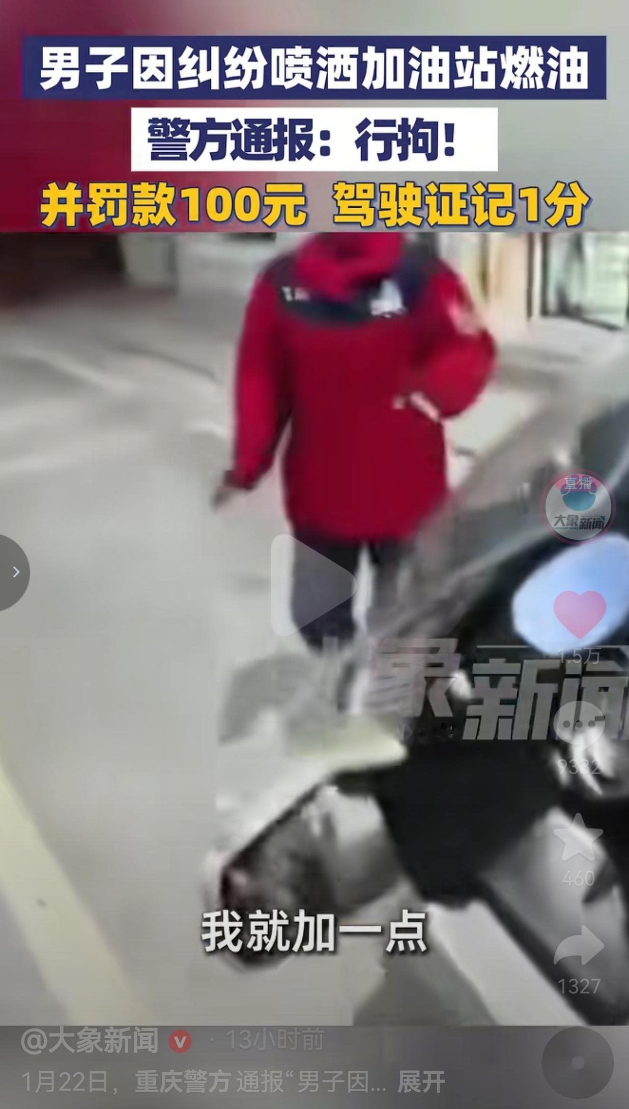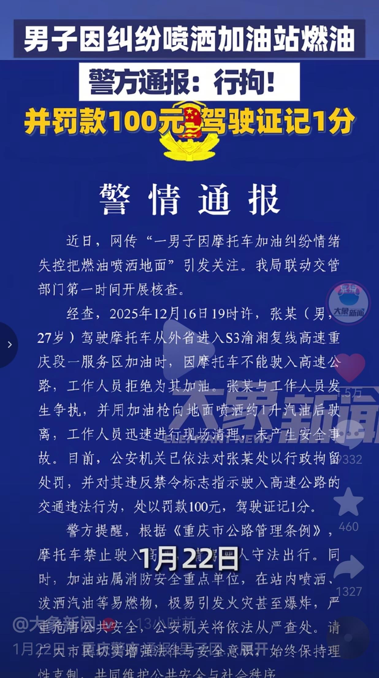 真的大无语事件!明知道自己是违法行为,被工作人员及时制止后,你还为难工作人员,这是正常人能干出来的事情吗? 根据大象新闻的报道,1月22日,重庆市南川区公安局发布通报。 事情是这样的,2025年12月16日晚上,27岁的张某骑着摩托车从外省进入重庆S3渝湘复线高速的一个服务区,想给车加油。 结果,工作人员告诉他:“摩托车不能上高速,按相关规定不能给你加油。” 谁知道张某一听就炸了,当场和工作人员吵了起来,情绪激动之下,居然抢过加油枪往地上喷了约1升汽油,然后骑上摩托车就跑了。 万幸的是,工作人员第一时间清理了现场,没有引发火灾或爆炸,不然后果不堪设想。   事后,警方很快就找到了张某,直接给了他行政拘留的处罚,还针对他违反禁令标志驶入高速的行为,罚了100块钱,驾驶证记1分。 网友看到后评论道:“这是疯了吗?加油站撒汽油,想把整个服务区都炸了?” 还有的网友说:“工作人员也是倒霉,好好上班怎么遇到这种蛮不讲理的人呢。” 其实这事儿说白了,就是情绪失控惹的祸。张某觉得自己被拒绝了很没面子,就想用极端方式泄愤,但是,他完全没考虑过加油站是易燃易爆的重点区域,他这一喷,不仅害了自己,还把别人的生命安全置于危险之中。 我们常说“冲动是魔鬼”,但在加油站这种地方,冲动可能就是炸弹。一个人的情绪失控,可能会让整座加油站变成火海,这种代价谁都付不起。 这件事也提醒我们:在公共场合,你的情绪从来都只属于你自己,但你的行为会影响到所有人。学会控制情绪,不仅是对自己负责,也是对别人负责。 希望所有的人,都能遵守法律法规,保持良好的情绪,不给自己惹事,也不给别人找麻烦。