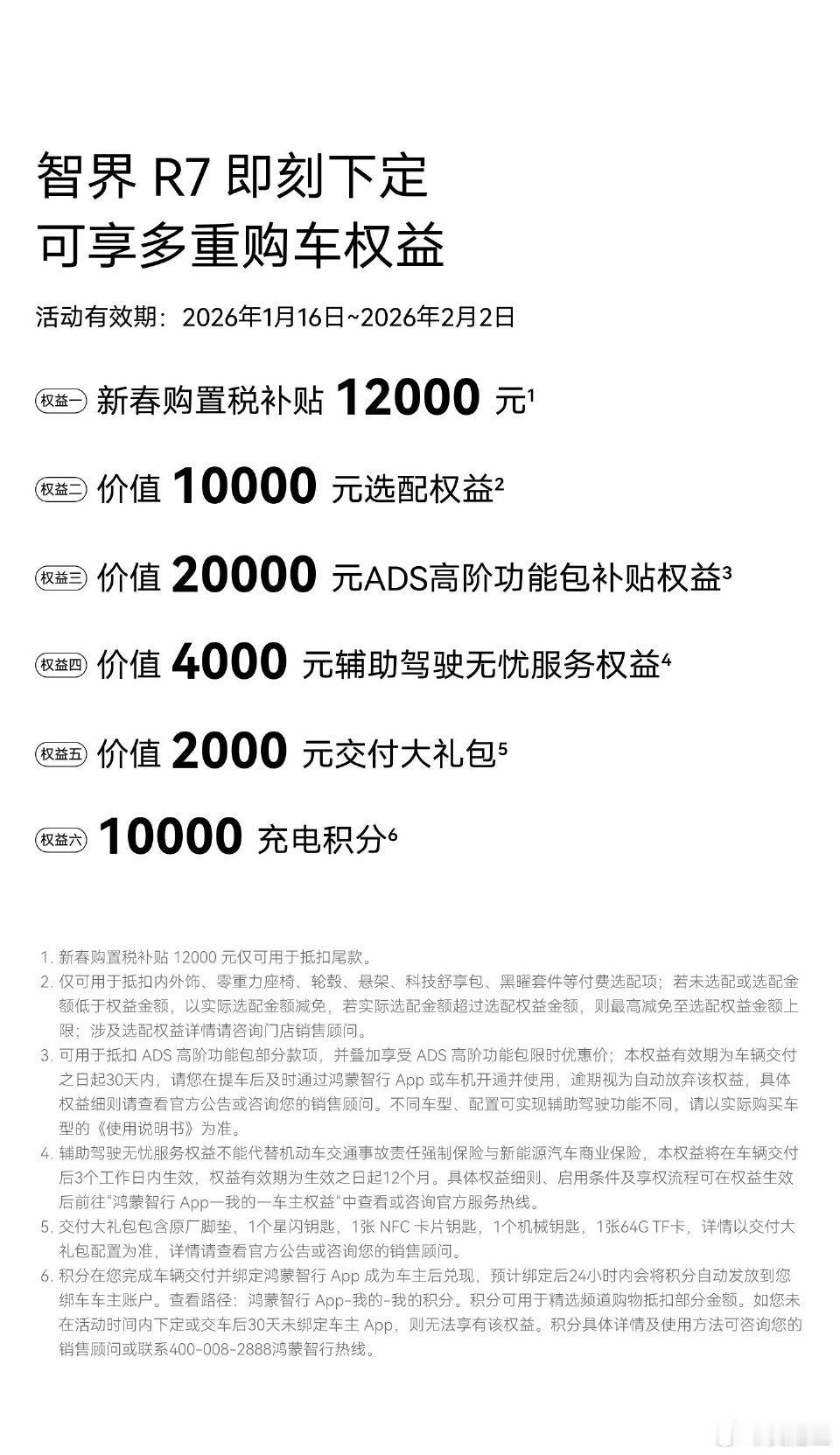 智界汽车新春购车权益加码智界这波福利太实在!1月16日到2月2日,买全系车型至高能拿12000元购置税补贴抵尾款,智界R7和新S7购车权益分别高达49000元、59000元,多重礼遇助力轻松购车。好价还得有好产品。智界R7创下“全球量产SUV最低风阻”纪录,更低风阻带来低能耗、长续航与安静体验,背后是工程师无数次优化。市场也给出肯定,它连续3个月交付破万。年前想换车,智界值得一看!