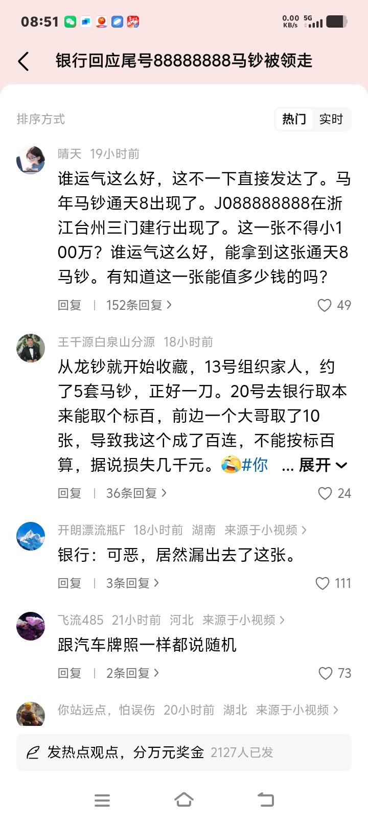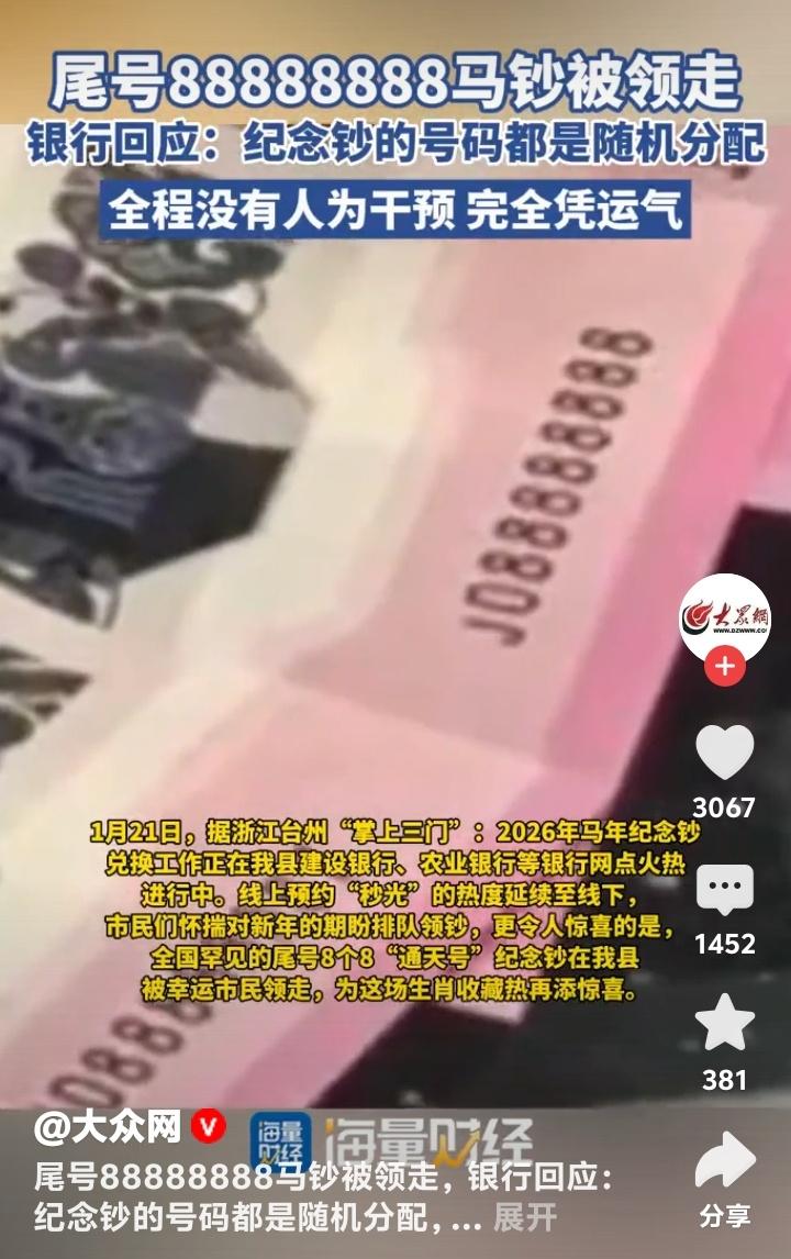 洵哥的第二故乡浙江台州三门县惊现“天选之钞”!全国唯一尾号88888888马年纪念钞被神秘人领走,百万财富是陷阱还是馅饼? 一张小小的绿色塑料片,此刻正躺在浙江台州三门县某个不为人知的角落,却搅动了全国收藏界的风云。它的面值仅二十元,但身价已被喊至百万。这不是电影剧本,而是正在发生的财富神话。当绝大多数人还在为抢到一张普通马钞而庆幸时,命运的齿轮已为那个“天选之人”悄然转动。 全国仅此一张的“麒麟号”,数字八的极致排列,承载着国人对“发”的终极迷恋。它从一亿张钞票中脱颖而出,概率堪比宇宙尘埃恰好落入掌心。这已超越收藏,成了一场关于运气与阶层的全民窥探。人们追问,那个在三门县建设银行窗口接过它的,究竟是何方神圣? 是深耕钱币圈数十载、动用一切资源布网狙击的资深藏家?还是早起排队、只为给孩子留个新年念想的普通三门市民?匿名藏家一百三十万的隔空喊价石沉大海,更增添了故事的悬疑色彩。手握王炸却沉默如山,这淡定背后,是深谙奇货可居的智慧,还是对财富巨变尚未回神的茫然? 狂欢的B面,是根植人性深处的数字迷信与财富焦虑。我们为何对“88888888”如此疯狂?它像一面镜子,照见人们对确定性的渴望,在充满变数的时代,试图从一串数字中锚定幸运。当一套房首付凝于一张薄钞之上,围观者的心中五味杂陈,那是羡慕,是嫉妒,更有一丝“为何不是我”的无力叩问。 然而,顶级靓号的光芒,容易让人忽视脚下的坑洼。市场已闻风而动,各种“伪靓号”与“改号钞”混杂其间,专等眼热者上钩。真正的尾同“麒麟号”凤毛麟角,而人为涂改的号码,在放大镜下终将原形毕露。热潮之中,理性才是最好的护身符。 这张马钞的价值,真的只系于八个“8”吗?作为第二轮生肖钞的收官之作,其本身的工艺与时代意义,同样值得品味。徐悲鸿的奔马英姿,动感光变的安全线,它是一张钞,更是一件时代的微缩艺术品。剥离数字的浮华,其内在的文化价值,或许才是更长久的支撑。 三门县的这份“泼天富贵”,最终会流向何方?是悄然进入拍卖行完成天价交割,还是被主人默默珍藏,成为一段家族传奇?无论结局如何,它都已成为一个社会情绪的引爆点。它让我们看到,在数字化支付横扫一切的今天,人们对实体符号承载的吉祥寓意与暴富梦想,依然有着惊人的执着。 这张钞票,在喜欢收藏钱币及老旧物件的洵哥眼里,不是纸,是三门海风浸透的盐粒与汗碱。指尖触及的,是九三年冬夜监狱哨岗的铁冷,是训练场上磨破又结痂的青春。百万?数字罢了。真正压秤的,是那段把命交给战友、把根扎进台州泥里的岁月,三年的第二故乡台州三门生活洵哥终生难忘。钞票会旧,而三门给洵哥的胆魄与情义,早已印成了骨血里永不褪色的票根。 你或许与这张“通天号”擦肩而过,但属于每个人的“小确幸”从未缺席。翻开你手中的马钞,每一个号码都是独一无二的人生印记。这场由八个“8”引发的狂欢,终会平息,但它提出的关于价值、运气与追求的命题,值得我们长久思考。 马年纪念钞 财富密码