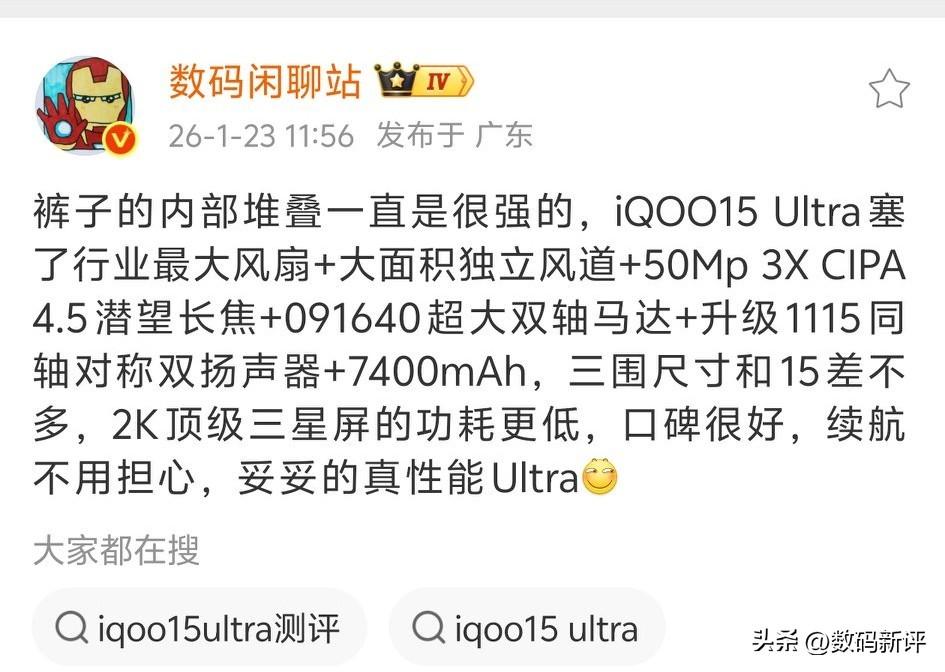 iQOO15Ultra配置爆料来了[灵光一闪]业界最大内置风扇!还有大面积风道设计,0916系大号双轴马达!电池容量增加到7400毫安,机身尺寸不变,升级了1115对称双扬!影像不是重点,可以期待一下量产机的性能释放[奸笑]看看能不能释放骁龙8Elite Gen5的极致性能!如果主摄X300标准版同款两亿主摄就好了,基本上没有缺点,就看定价