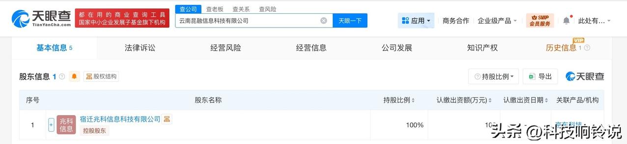 【京东在云南成立信息科技新公司】 天眼查工商信息显示,近日,云南昆融信息科技有限公司成立,法定代表人为季圣哲,注册资本100万人民币,经营范围含数据处理服务、信息技术咨询服务、信息咨询服务、大数据服务、互联网数据服务、网络与信息安全软件开发、数据处理和存储支持服务、信息系统集成服务、人工智能硬件销售等。股东信息显示,该公司由京东旗下宿迁兆科信息科技有限公司全资持股。 天眼查信息: