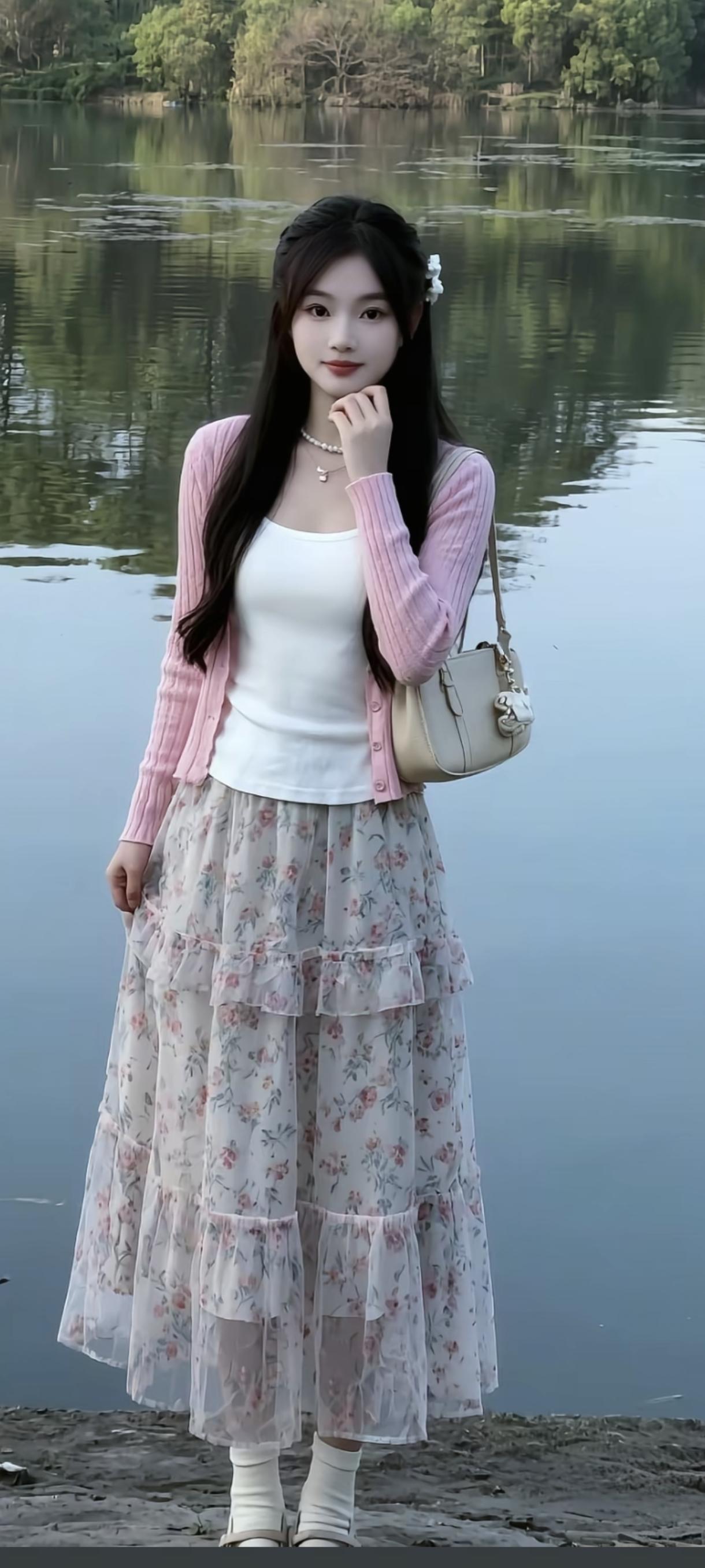 夏日清新穿搭,白色连衣裙搭配珍珠项链,自然风光中的优雅瞬间。