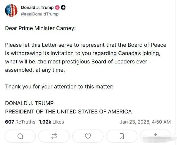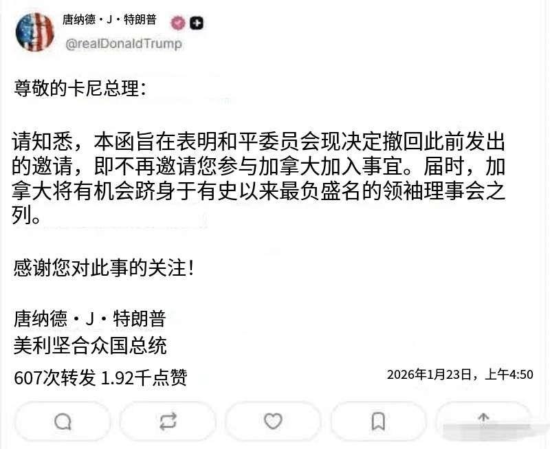 特朗普撤销加拿大加入和平委员会的邀请! 23日,特朗普利用媒体平台宣布撤销对加拿大总理卡尼发出的加入和平委员会的邀请。 全文如下(自动翻译) 尊敬的卡尼总理: 请知悉,本函旨在表明和平委员会现决定撤回此前发出的邀请,即不再邀请您参与加拿大加入(和平委员会)事宜。届时,加拿大将有机会跻身于有史以来最负盛名的领袖理事会之列。 感谢您对此事的关注! 唐纳德.J。特朗普美利坚合众国总统 落款是2026年1月23日。 儿戏!前脚刚刚发出邀请,因为不满卡尼的有关言论,就撤回了。这哪里是什么国际组织,简直就是一个黑帮尔尔。 另外,我觉得,特朗普的这封信函存在严重问题,那就是身份错了。他不应该以美国总统的身份,而是应该以“和平委员会”主席的身份。所以严格说,这件信函是不具备法律意义的。 不过,这也可能正符合加拿大的意图,本来就没想加入这个乌合组织!
