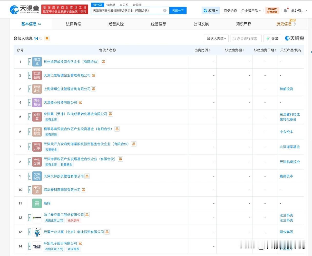 【蚂蚁集团、环旭电子等在天津成立投资合伙企业 出资额6.1亿】 天眼查工商信息显示,近日,天津海河曜仲股权投资合伙企业(有限合伙)成立,执行事务合伙人为天津文仲投资管理有限公司,出资额约6.1亿人民币,经营范围为以自有资金从事投资活动、投资管理。合伙人信息显示,该合伙企业由蚂蚁集团旗下云涌产业共赢(北京)创业投资有限公司、环旭电子(601231)、法兰泰克(603966)等共同出资。 天眼查信息: