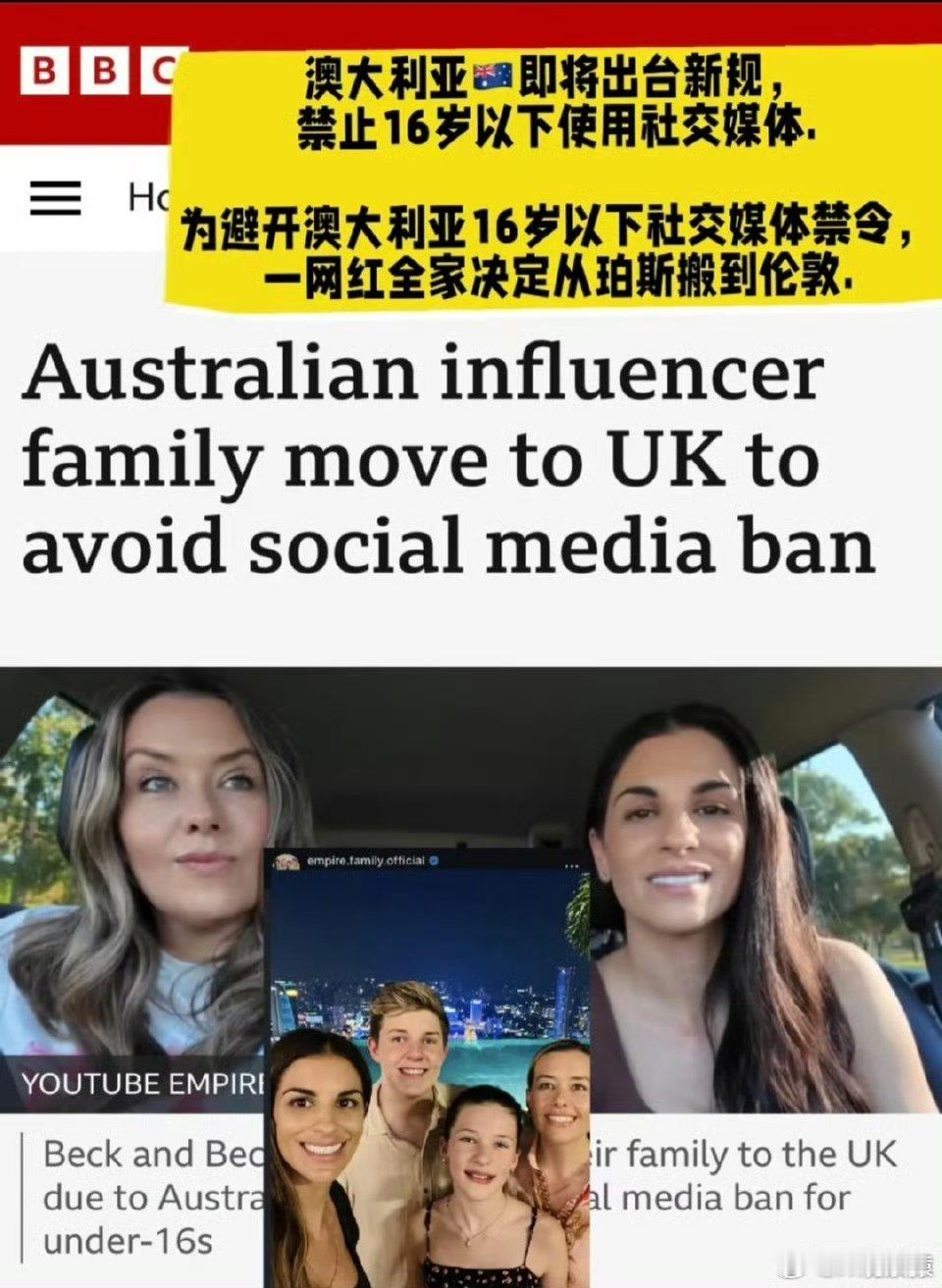 英国推动16岁以下禁用社交媒体之前澳大利亚禁止十六岁以下人士拥有社交媒体账号。为躲社媒体禁令,澳大利亚网红举家迁往英国,其14岁的女儿Charlotte在社交平台有百万粉丝,现在英国也禁止,再往哪里迁移?
