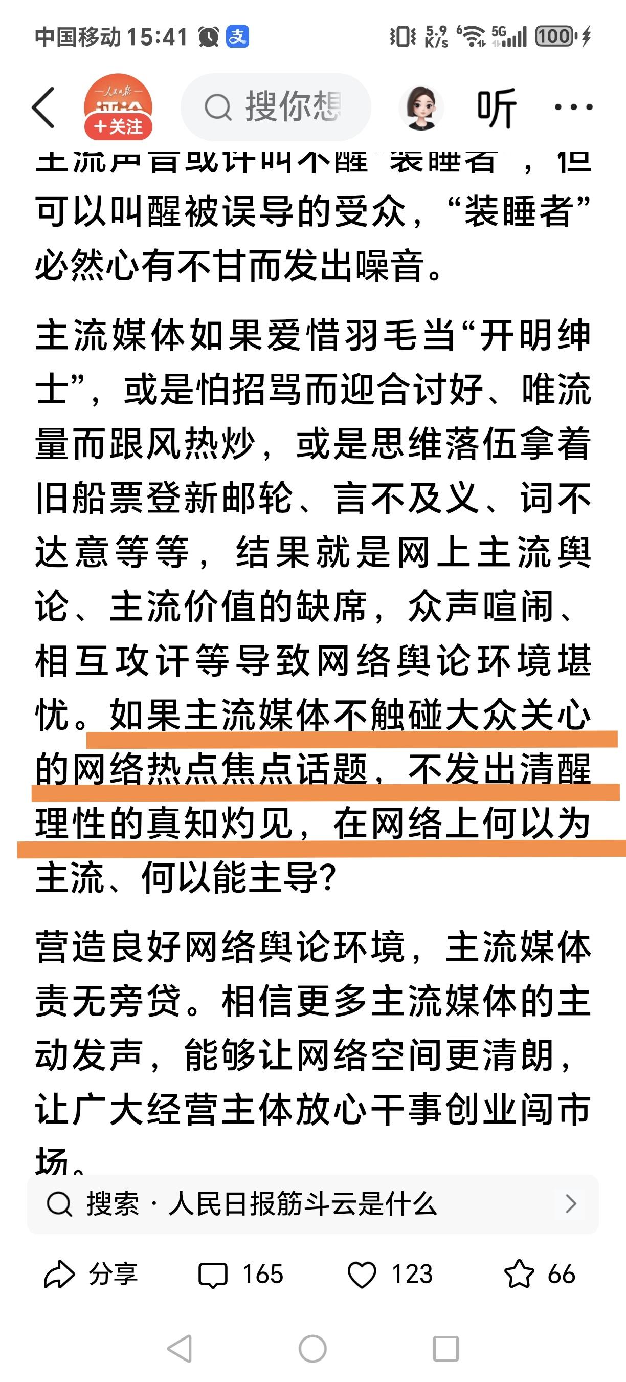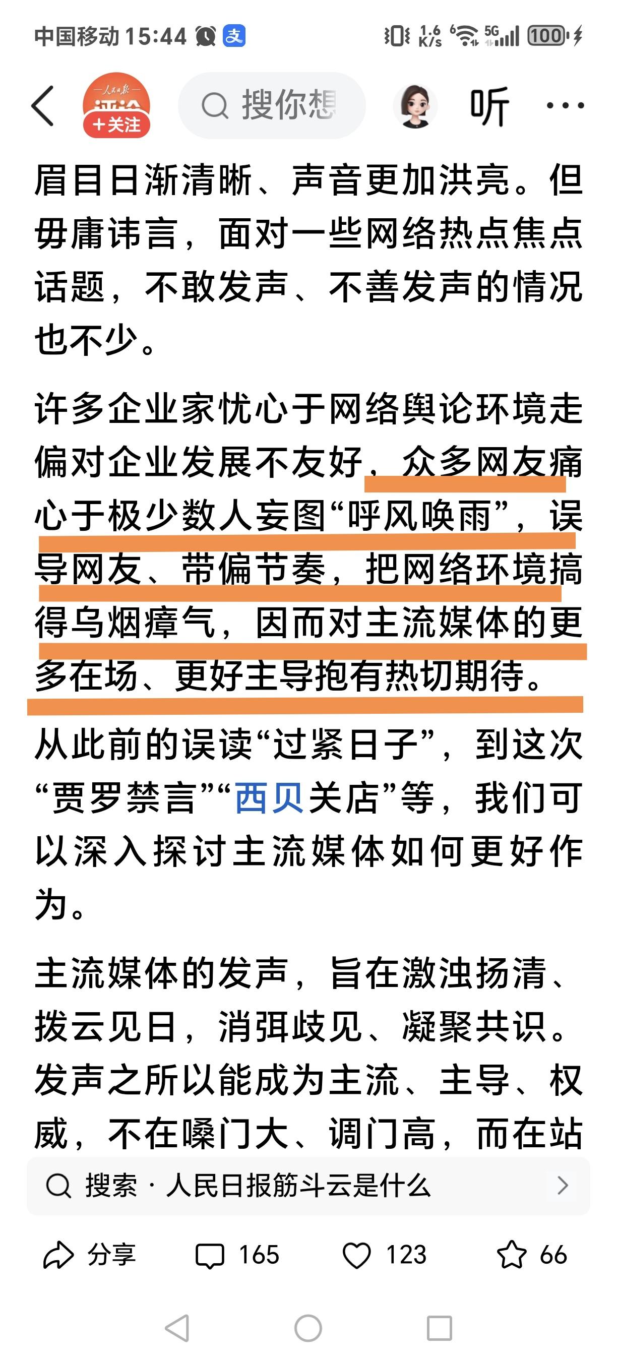 五天五评,汇聚成主流声音,一锤定音!这主流声音究竟代表谁?是能想人民之所想、急人民之所急吗? 人民日报五评《西贝事件》,从评网络舆论环境不应成为企业发展的短板,到评危机当前,坦诚才是最佳公关之道,再到评自媒体并非私域,不可肆意妄为!前天谈到网络平台不只有流量,更有责任在肩;今日评主流媒体代表主流声音,能消除歧见,凝聚共识! 媒体是服务于人民的!如此,广大人民群众的声音,理当成为主流之声。