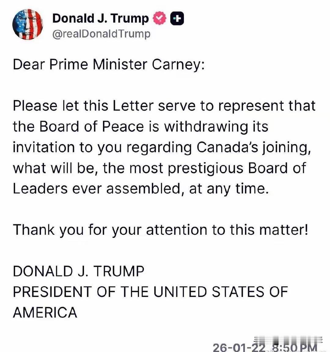 近日,特朗普在社交媒体发文拒绝了加拿大加入和平委员会的请求:“亲爱的卡尼总理 请允许此信函代表和平委员会正式撤回此前向您发出的、关于邀请加拿大加入史上最具声望领袖委员会的邀请。感谢您对此事的关注!” 在拒绝加拿大的同时,特朗普极希望加入的意大利却拒绝加入。对此特朗普似乎有点气急败坏,随即发文痛斥欧洲!