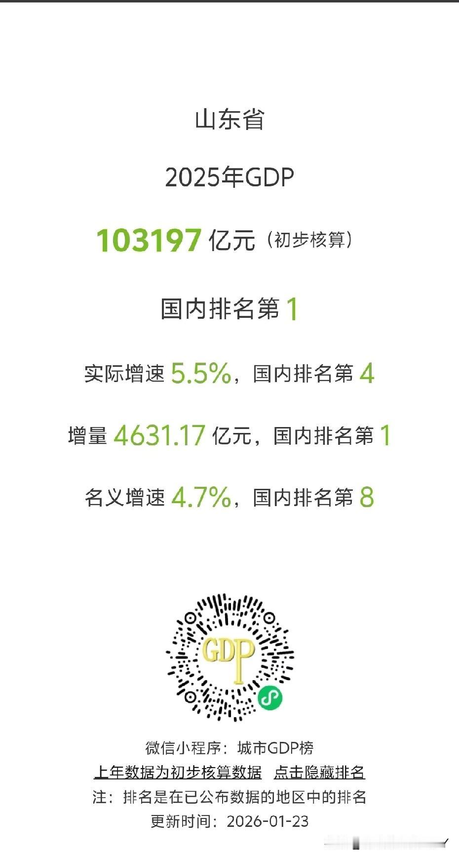 山东北方第一,全国第三的位置稳了,浙江追上还要几年吧? 今日山东GDP数据一亮相,就亮出了硬核成绩单——103197亿元。实际增速5.5%,名义增速4.7%,增量4631.17亿,在目前已公布数据的省市里,稳稳坐住了头把交椅。 另一边,浙江的表现同样亮眼。经济总量一举突破9万亿,达到94545亿,实际增速同样是5.5%,增量约4538亿元,名义增速5.04%。这组数字往那儿一摆,谁都能看出浙江经济的强劲势头,活力挡都挡不住。 单看增量,山东和浙江咬得很紧,差距不算大。只是山东的名义增速稍逊一筹,这提醒着,想保持领先,还得再加把劲。毕竟标兵在前,追兵也不慢,半点松懈不得。 话说回来,山东这份“稳”劲儿,确实难得。作为第三经济大省,能始终保持平稳上升,名义增速还超过全国平均水平,这份定力可不是谁都有。 就像老话说的“路遥知马力”,经济发展拼的不是一时冲刺,而是长久的耐力。山东这些年一步一个脚印,把基础打得扎实,才有了今天的稳健底气。 浙江的冲劲也值得说道,从民营经济的灵活到数字经济的领跑,它总能在新赛道上找到发力点,名义增速领先也就不奇怪了。这其实也给山东提了个醒:稳扎稳打的同时,若能多些创新突破,说不定能跑得更快。 老百姓看经济数据,不光看数字大小,更看日子能不能跟着变好。山东的稳,意味着就业有保障、民生有底气;浙江的活,意味着机会更多、创新更旺。两省各有千秋,却都在朝着让经济更景气、百姓更幸福的方向使劲。 未来的路还长,山东想继续领跑,就得在“稳”的基础上多添点“闯”的劲头。浙江也得在“活”的优势里再夯实“稳”的根基。毕竟,经济发展就像长跑,既要速度,更要耐力,能把两者兼顾好,才能走得更远。 期待山东接下来能再加把油,在稳扎稳打的同时加快脚步,让这份“稳”里透出更多“进”的锐气。相信只要方向对了,步子实了,山东的经济版图还能再扩扩,老百姓的日子也能再红火红火。