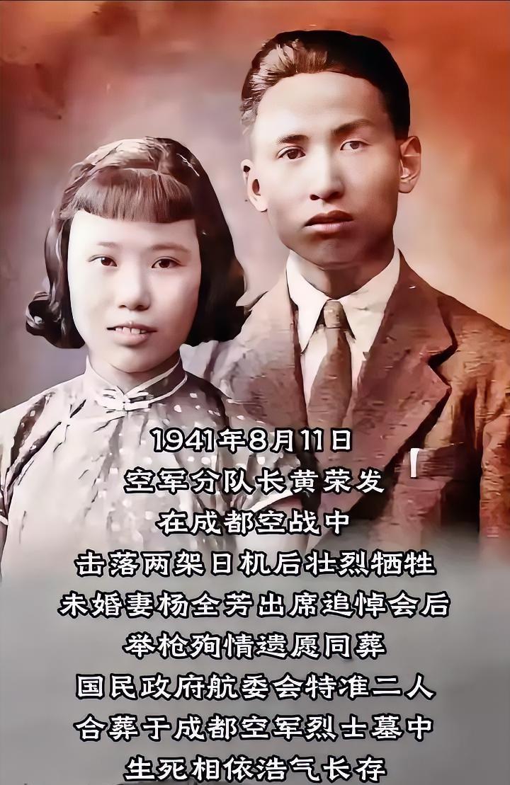 1941年8月11日,空军分队长黄荣发在成都空战中击落两架日机后壮烈牺牲。未婚妻杨全芳出席追悼会后举枪殉情,遗愿同葬。国民政府航委会特准二人合葬于成都空军烈士墓中,生死相依,浩气长存。 那天的成都,天空并不平静。防空警报撕破了长空,日军轰炸机群像一群黑压压的乌鸦,再次扑向这片饱受摧残的土地。黄荣发驾驶着他那架苏制伊-15战斗机,义无反顾地冲入敌阵。 那时候的中国空军,飞机打掉一架少一架,飞行员更是无比珍贵的种子。每一次升空,都可能是永别。黄荣发心里清楚,但他更清楚的是,身后就是成都的街道、学校,还有千千万万手无寸铁的同胞。 空中格斗异常激烈,他凭着过人的胆识和技术,咬住一架敌机,猛烈开火,敌机拖着黑烟栽了下去。紧接着,他又锁定了第二个目标……就在完成又一次漂亮击落的瞬间,他的战机也被敌人的炮火击中。年仅24岁的黄荣发,没能看到那天的日落。 消息传到后方,对于一个人来说,天塌了。这个人就是杨全芳。她和黄荣发的故事,没有太多花前月下的浪漫。那是烽火连天的岁月,爱情往往来得纯粹而炽烈。他们或许是在一次慰问活动中相识,他一身戎装,英气勃勃;她温婉坚毅,眼神里满是钦佩。战时的恋爱,总是聚少离多。 每一次他驾机升空,她的心就跟着悬到了天上;每一次他平安归来,对她而言就是一场盛大的节日。他们订了婚,约好了等把鬼子赶出中国,就举办一场像样的婚礼。一枚戒指,一个承诺,成了杨全芳全部的人生期盼。 期盼最终等来的是灵堂。追悼会现场,肃穆而悲壮。黄荣发的遗像挂在中央,照片上的他目光坚定,还是那么年轻。各界人士送来挽联,表彰他“卫国捐躯,功在苍穹”。 杨全芳一身素缟,站在人群里,异常平静。她静静地听着人们对未婚夫的褒奖,看着那面覆盖着灵柩的国旗,心里那份巨大的空洞却在吞噬一切。对她而言,国家失去了一个英雄,而她,失去了整个世界,失去了那个允诺给她未来的人。哀莫大于心死。 谁也没想到,这位看似柔弱的女子,做出了最刚烈的决定。追悼会结束后不久,杨全芳用一把手枪,结束了自己的生命。她留下的遗愿很简单,也很震撼:生未同衾,死愿同穴,请让她与黄荣发合葬。 在那样一个时代,这个举动惊世骇俗。然而,面对这份以生命写就的深情,即便是严苛的军方也无法不动容。国民政府航空委员会经过慎重商议,最终特批同意,将这对爱人合葬于成都空军烈士墓。这在中国空军历史上,是极为罕见的一例。冰冷的规章,为人间至情让了路。 从此,成都空军烈士墓里,有了一座特殊的墓碑。它不仅仅纪念一位血洒长空的勇士,也安放了一段至死不渝的爱情。黄荣发是为了守护脚下的国土和同胞而死,那是大爱;杨全芳是为了一份刻骨铭心的承诺而去,那是挚情。他们的生命以这样一种惨烈的方式缠绕在一起,共同化作那个苦难时代里,一曲令人心碎又无比崇高的挽歌。 我们翻开抗战史,记载的多是战役、将领和宏观的数字。但像黄荣发与杨全芳这样的故事,才是历史最真实的肌理和温度。他们让我们看到,在那场救亡图存的伟大斗争中,个人付出了怎样具体而微的代价。 牺牲的何止是生命,还有原本可以拥有的平凡幸福。正是千千万万这样的牺牲,才撑起了民族不屈的脊梁。他们的墓,是英雄冢,也是爱情碑,永远向后人诉说着:有一种忠贞,可以跨越生死;有一种气节,名为浩气长存。 各位读者你们怎么看?欢迎在评论区讨论。 参考信源: 1. 《解放军报》旗下“钧正平工作室”曾发表文章《永远仰望,那些为我们撑起晴空的英雄》,其中记述了多位抗战空军烈士的感人事迹,黄荣发与杨全芳的故事是其中突出代表。