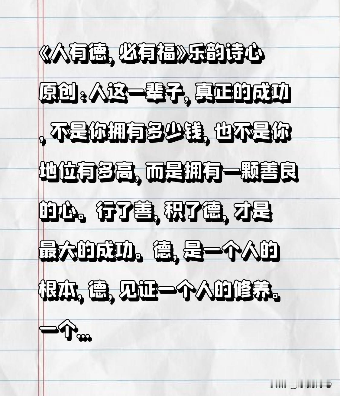《人有德,必有福》乐韵诗心原创: 人这一辈子,真正的成功,不是你拥有多少钱,也不是你地位有多高,而是拥有一颗善良的心。行了善,积了德,才是最大的成功。德,是一个人的根本,德,见证一个人的修养。一个人的德行,来自于一颗善良的心,一个人的修养,来自于一份端正的品德。人只有品德好,一切才会好,能得到别人的肯定和认可,德行深厚福报多,因此,人这一生无论年轻和年老,要多行善事,这样才会有好报。