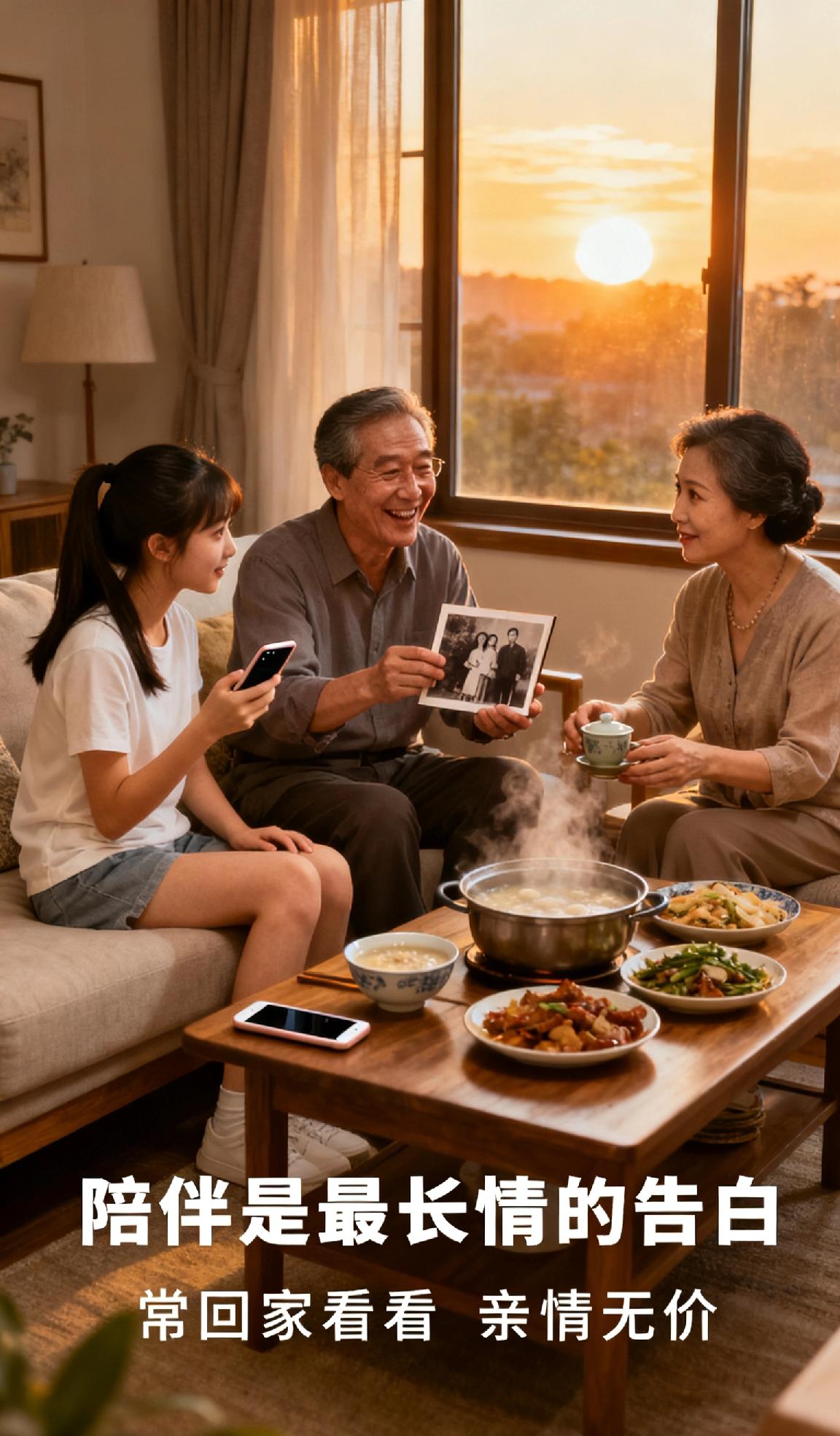 他们要的很简单: 是你放下手机,陪他们唠唠家常的时光; 是你带着微笑,耐心听他们重复年轻故事的模样; 是让他们感觉“被需要”,那份踏实的温暖。 黄金万两,不如一粥一饭的温情; 山珍海味,抵不过你坐在身旁的安心。 常回家看看,多些回应与陪伴,便是最深情的孝顺。你有多久没好好陪父母吃饭聊天了? 陪伴是最长情的告白 常回家看看