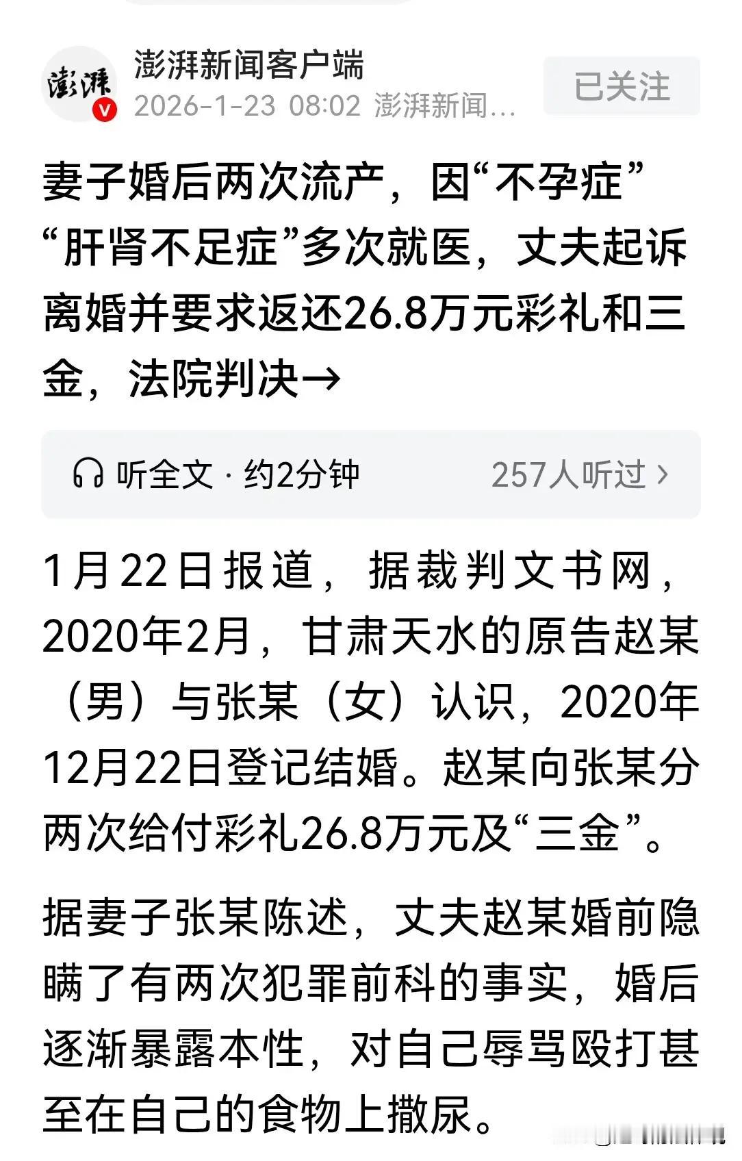 在天水这片热土上,有一段令人扼腕叹息的爱情故事,犹如一场荒诞的闹剧,却深刻揭示了人性中的善与恶、责任与背叛。故事的女主角,本是一位善良坚韧的女子,心怀感恩之心,渴望家庭的温暖,却不料遭遇了人间最阴暗的一面。 她与丈夫结缔良缘,迎来了人生的第一缕曙光。丈夫慷慨解囊,给了26.8万彩礼和三金,仿佛天降甘露,滋润着新婚的喜悦。然而,人生如戏,谁曾想,婚后却是一场噩梦的开始。丈夫不仅对她辱骂、殴打,还在她的食物中撒尿,以羞辱她的尊严。更令人发指的是,她后来才得知,丈夫竟然隐瞒了两次犯罪前科的事实,令人愤怒至极。 在苦难中,她怀孕了,然而命运多舛,两次都未能保住孩子。多次手术,身心俱疲,更患上了不孕症和肝肾不足症,成为身心双重折磨的受害者。她的生命仿佛被阴影笼罩,却依然坚强面对,彰显出“天道酬勤,逆境藏金”的精神。 面对丈夫的冷漠与嫌弃,她选择了依法维权。两次起诉离婚,第二次更是要求返还彩礼及三金,法院判决她返还9万元彩礼和三金。女子不服,提起上诉,彰显了“逆境不屈,正义必胜”的信念。 这段故事告诉我们,真正的健康不仅是身体的强健,更是内心的坚韧与阳光。健康的生活,应该是内外双调,心怀感恩,善待自己,也善待他人。生活不易,但只要心存希望,善良与正义终会胜利。 让我们以这位女子的坚韧为镜,传递正能量,呼吁社会关注家庭暴力与婚姻中的隐患。愿每个人都能拥有一份感恩之心,珍惜眼前人,守护家庭的温暖。因为,真正的幸福,是内心的平和,是身心的健康,是感恩与善良的光辉照耀下的美好人生。让我们携手共筑一个充满爱与希望的世界!
