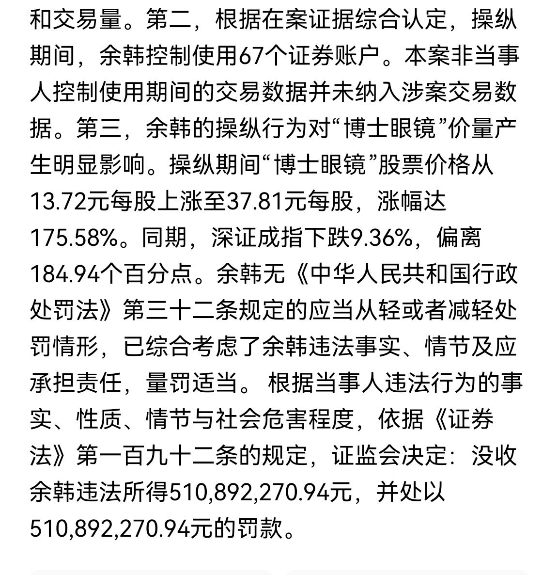 太震撼了,刚刚消息一个自然人违规控制账号炒股被罚没超10亿元人民币。有没有人科普一下,这个余韩是哪一个大神,算不算的上最强游资? 根据媒体刚刚报道余韩操控67个账户炒作股票,被证监会处于没收违法所得5亿1千万左右,另加罚款5亿1千万左右。 让股市小白,很震惊,所以余韩是谁?全是游资大佬吗?