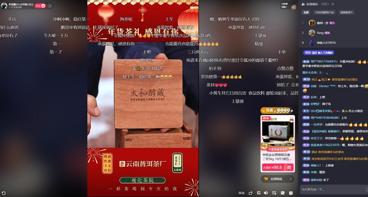 今晚,李亚鹏继嫣然天使医院事件后,开启首次带货直播,主题是:云南普洱茶。 因为在嫣然天使医院事件中的良好形象,李亚鹏近期在网络上很出彩,在我印象里他曾经饰演的《独孤九剑》令狐冲一角算是,中国武侠剧里十分不错的近乎完美的主角。 在经历和天后王菲的一段感情,以及云南丽江的地产项目等事件,李亚鹏一直以来都是不温不火,甚至屡次被传破产等负面消息。 没有人会想到,在2026年伊始,因为嫣然天使医院,公益治疗兔腭裂唇,李亚鹏先生的网络口碑急转往上,获得了网友们的一致好评。 因此,在今晚的带货直播中,李亚鹏先生的直播间人数也是一直保持在10W+,带货榜上也一直在前二,和董宇辉僵持不下。直播间反响强烈,所主带的普洱茶也都是“秒抢光”。