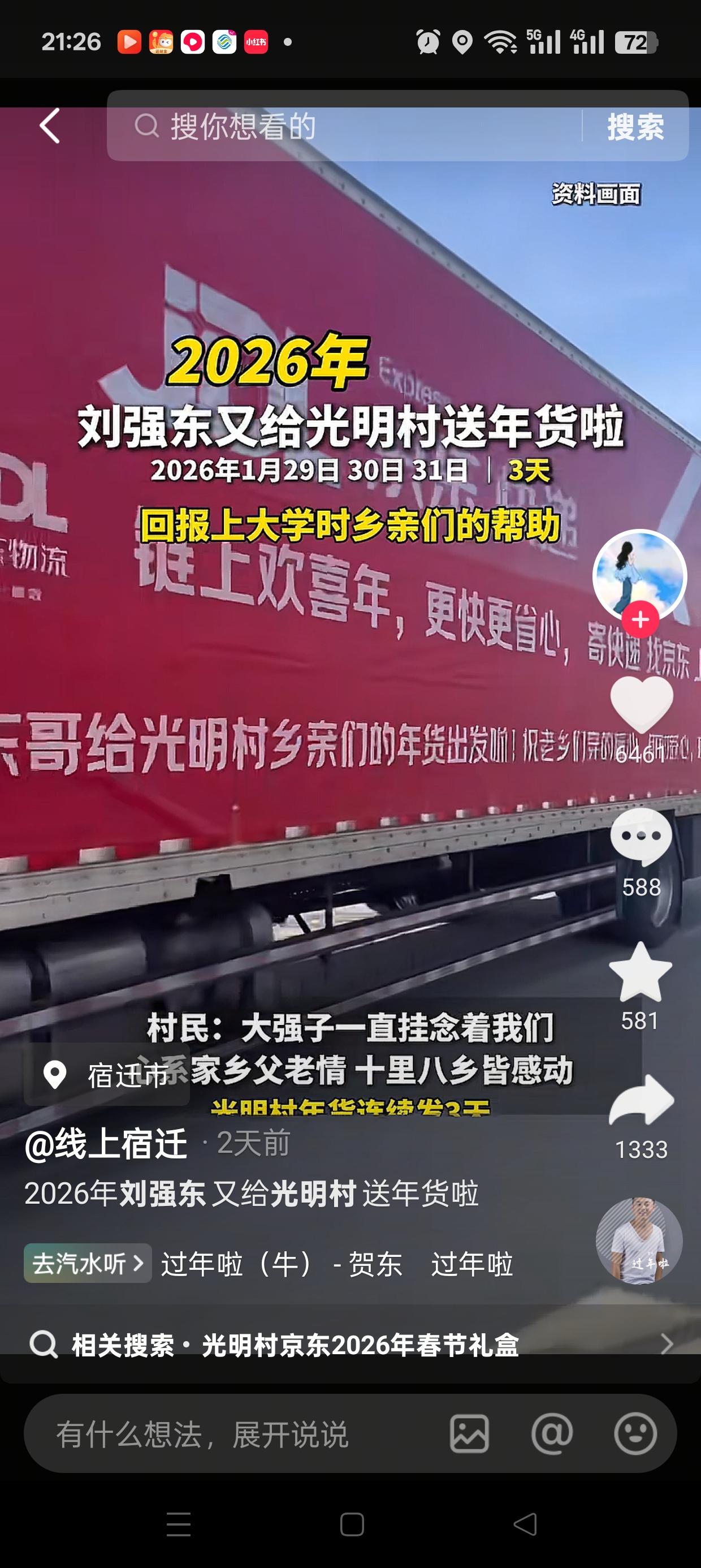 12年,3000万,一辆辆卡车开进苏北小村。当绝大多数富豪选择把财富锁进信托基金时,刘强东却固执地把现金、年货和工厂,撒回了那片曾用“500元和76个鸡蛋”托起他的土地。有人笑他“土”,他却用最笨的方式,完成了一个中国企业家最动人的“情感闭环”。 不管乡亲们怎么看刘强东,但是刘强东始终心里装着乡亲们。 临近春节,这位从江苏宿迁光明村走出的企业家,再次踏上了回乡路。消息说,他计划在1月底回去,给老家的父老乡亲送上新春年货。这已是他连续第12年坚持这件事了。 回报“500元和76个鸡蛋”的恩情 时间倒回几十年前,刘强东要去北京读大学,家境困难。是村里的乡亲们,你一点我一点,为他凑出了500块钱和76个鸡蛋,帮他走出了农村。这份恩情,他记了一辈子。如今,他用最直接的方式回报:给村里60岁以上的老人,每人发1万元现金红包;给他当年在光明村上学时的所有小学老师,每人准备一个10万元的现金大红包。除了现金,还有实实在在的年货:电动车、冰箱、取暖器、助听器、米面粮油……琳琅满目,由十几辆卡车运到村里。有村民骑着三轮车来拉年货,还有人情不自禁地送上了锦旗。粗略算算,今年这些现金和物品,总价值超过了3000万元。 超越了“衣锦还乡”的深层连接 如果只是偶尔一次的“衣锦还乡、光宗耀祖”,故事或许没那么动人。难能可贵的是持续了12年的习惯与牵挂。这些年,他不仅送年货,更把京东的全国客服中心、云计算基地等重大项目带回家乡,累计投资超过200亿元,为当地带来了实实在在的产业和就业。 他的行为,触动了很多人的心。有网友说:“我就看好大强子!懂得感恩,是个了不起的企业家!” 也有网友感慨:“即便是自己的儿子,也未必有这么大方。” 这些评论背后,是大家对一个成功企业家不忘本、重情义品格的认可。 一种可贵的示范:成功与乡土的情感闭环 在当今社会,刘强东的年货,送的早已不只是物质。它传递的是一种价值观:个人的成功,离不开集体的托举;而真正的成就,在于有能力回馈那份最初的温暖。他的故事,为一个朴素的道理写下了生动的注脚——财富的意义,在于流动与分享;人生的根脉,在于不忘来处与初心。这或许就是“大强子”年复一年,坚持回乡的“图”之所在。