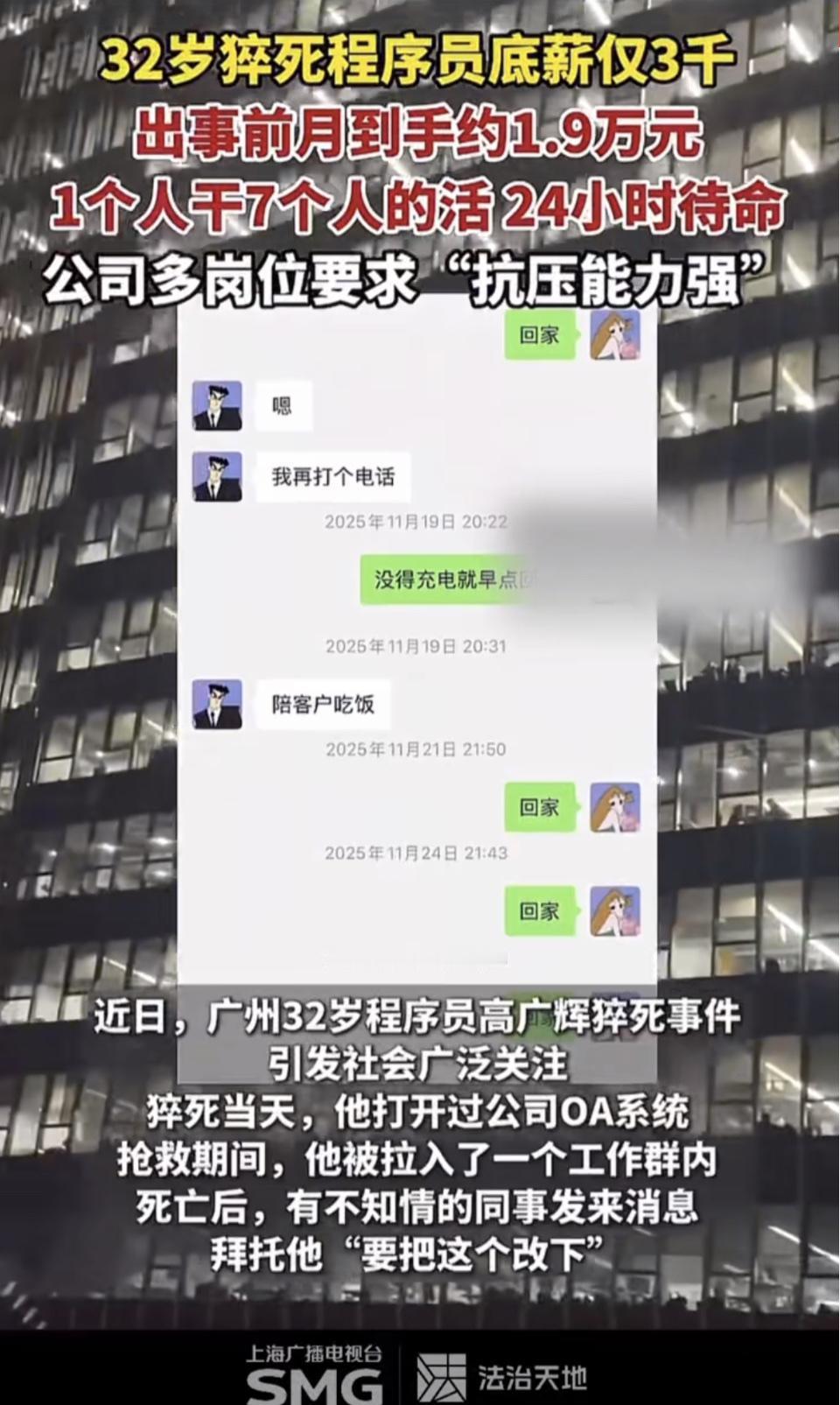 32岁程序员猝死,底薪才3千,这事儿听起来就离谱。现在大家总说程序员高薪,可这哥们儿底薪这么低,还得承受巨大工作压力,太惨了。 一般印象里,程序员整天对着电脑,加班是常态。每天从早到晚敲代码,眼睛累、脑子累,身体也跟着垮。32岁,正是人生黄金时期,却因为工作丢了性命。这也给大家提了个醒,工作再重要,也不能以命相搏。企业也该反思,别只盯着业绩,员工的身心健康同样关键。希望悲剧不再重演啊。 青年猝死 程序员生存现状 下班后猝死 大龄程序员 工位猝死 景区猝死 岗位死亡