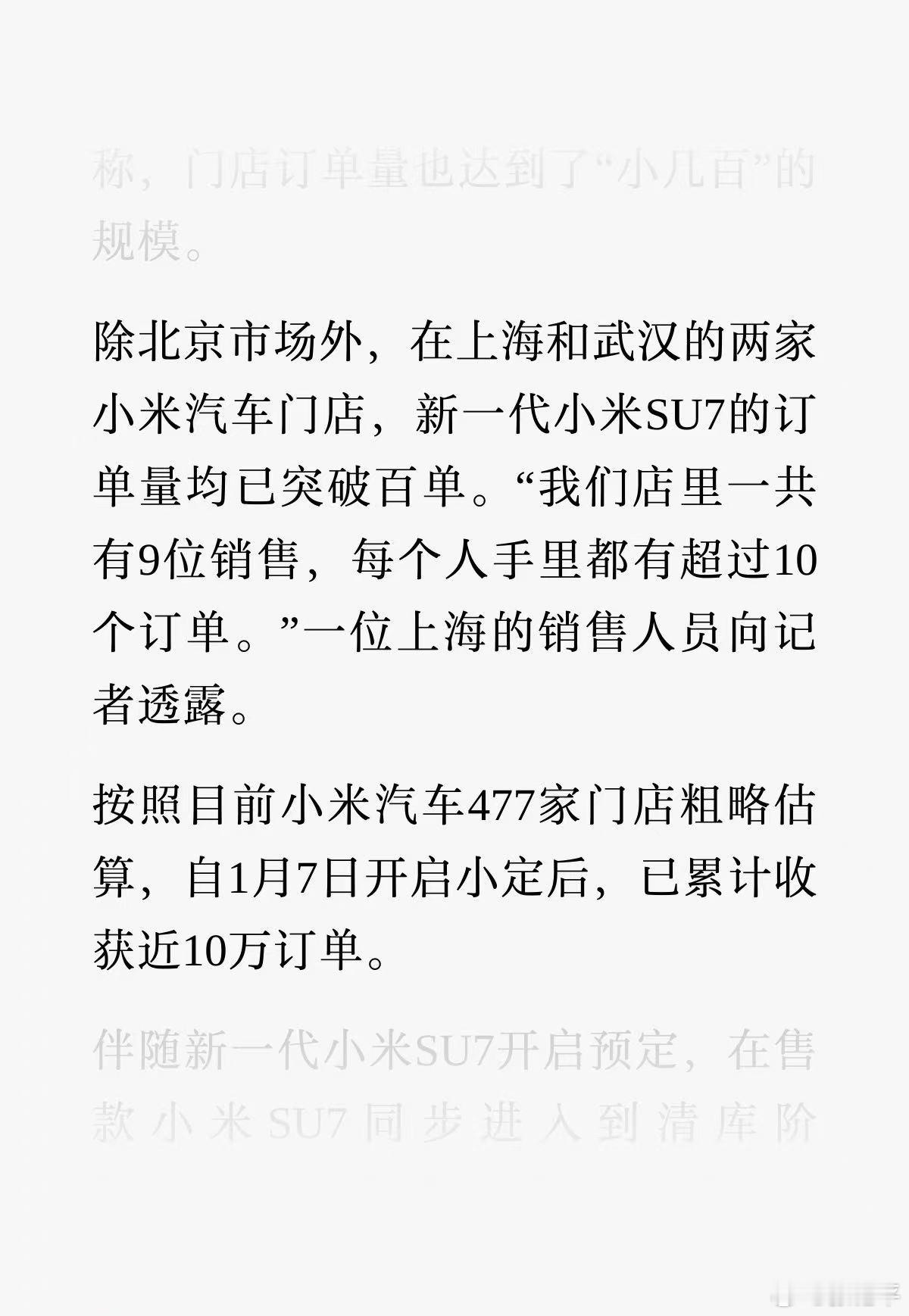 新一代小米SU7预售半月订单近10万其实按照几个门店的订单量去推算,数据不会很准,但新SU7的订单应该不少。从1月份开始,各品牌销售都在叫苦时,小米那边的兄弟倒是更淡定一些。虽然整体市场偏冷,只横向比较,小米有新SU7预售能稳很多。新能源汽车大v聊车