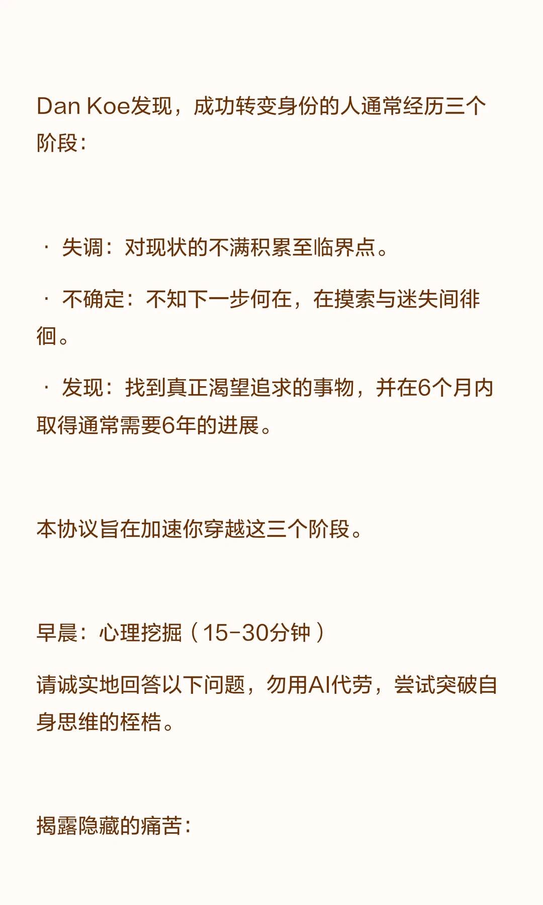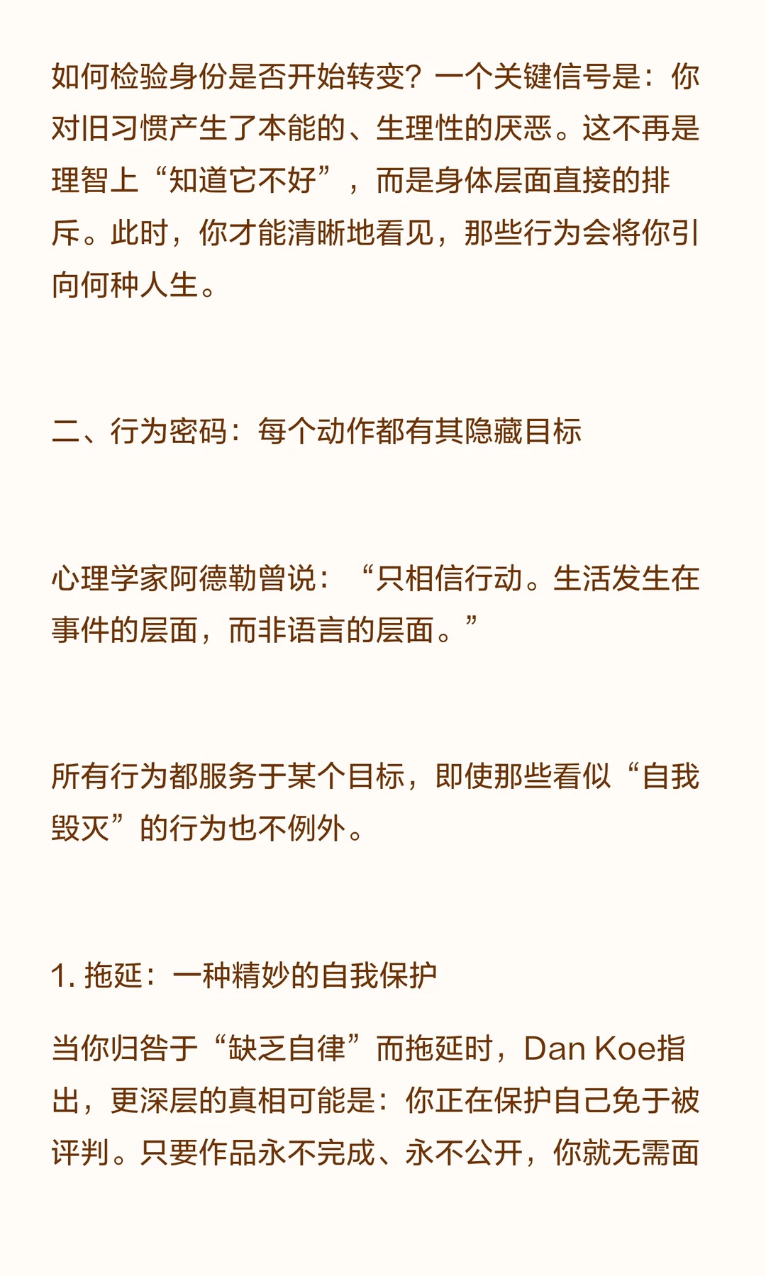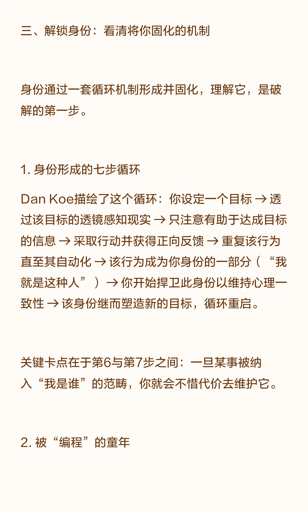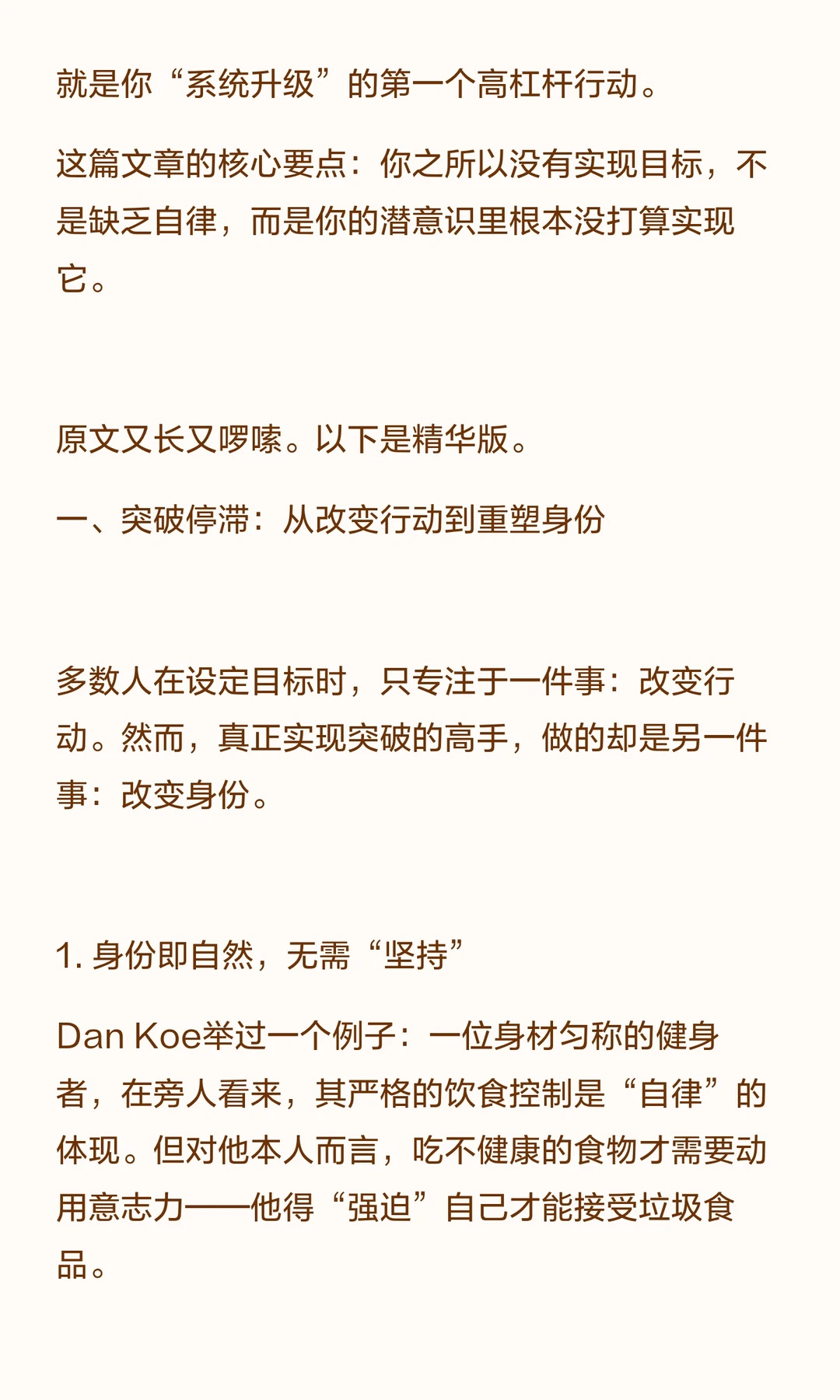 这篇文章通过“改身份”而非“改行动”,提供系统性解决方案,帮助读者从身份认同入手,重塑生活。 核心在于重塑潜意识,在于打破旧模式,建立新身份,通过“一日重塑协议”整合洞察,最终实现持久改变。