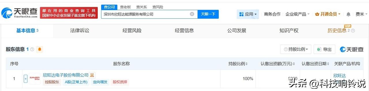 【欣旺达成立能源服务公司 注册资本5000万】 天眼查App显示,1月23日,深圳市欣旺达能源服务有限公司成立,法定代表人为王威,注册资本5000万人民币,经营范围包括以自有资金从事投资活动、创业投资、融资咨询服务等,由欣旺达(300207)全资持股。 天眼查信息: