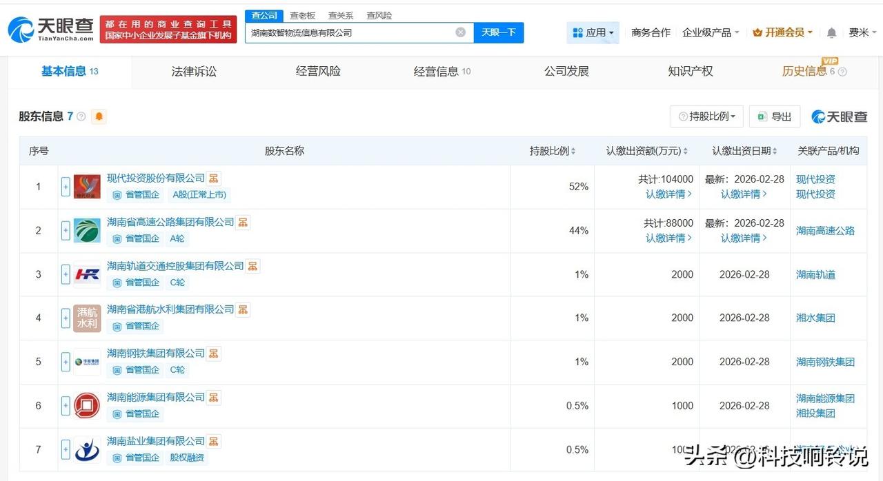 【湖南数智物流信息公司登记成立 注册资本20亿】 天眼查App显示,近日,湖南数智物流信息有限公司成立,法定代表人为张龙兴,注册资本20亿人民币,经营范围包括第二类增值电信业务、互联网信息服务、建筑用钢筋产品生产、非煤矿山矿产资源开采等,由现代投资(000900)、湖南省高速公路集团有限公司、湖南轨道交通控股集团有限公司等共同持股。 天眼查信息: