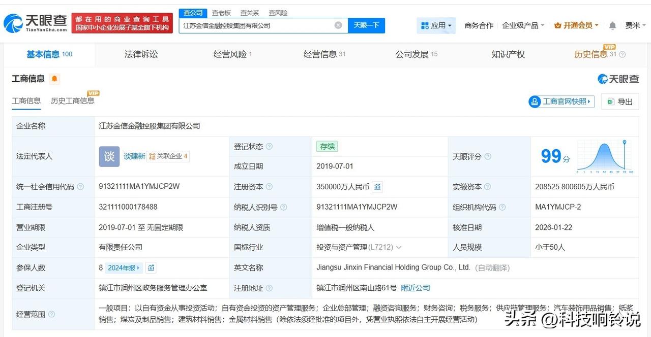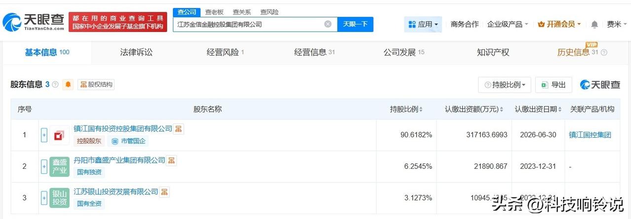 【江苏金信金融控股集团增资至35亿 增幅约50%】 天眼查App显示,近日,江苏金信金融控股集团有限公司发生工商变更,注册资本由约23.3亿人民币增至35亿人民币,增幅约50%。 该公司成立于2019年7月,法定代表人为谈建新,经营范围包括以自有资金从事投资活动、自有资金投资的资产管理服务、企业总部管理、融资咨询服务等,由镇江国有投资控股集团有限公司、丹阳市鑫盛产业集团有限公司、江苏银山投资发展有限公司共同持股。 天眼查信息: