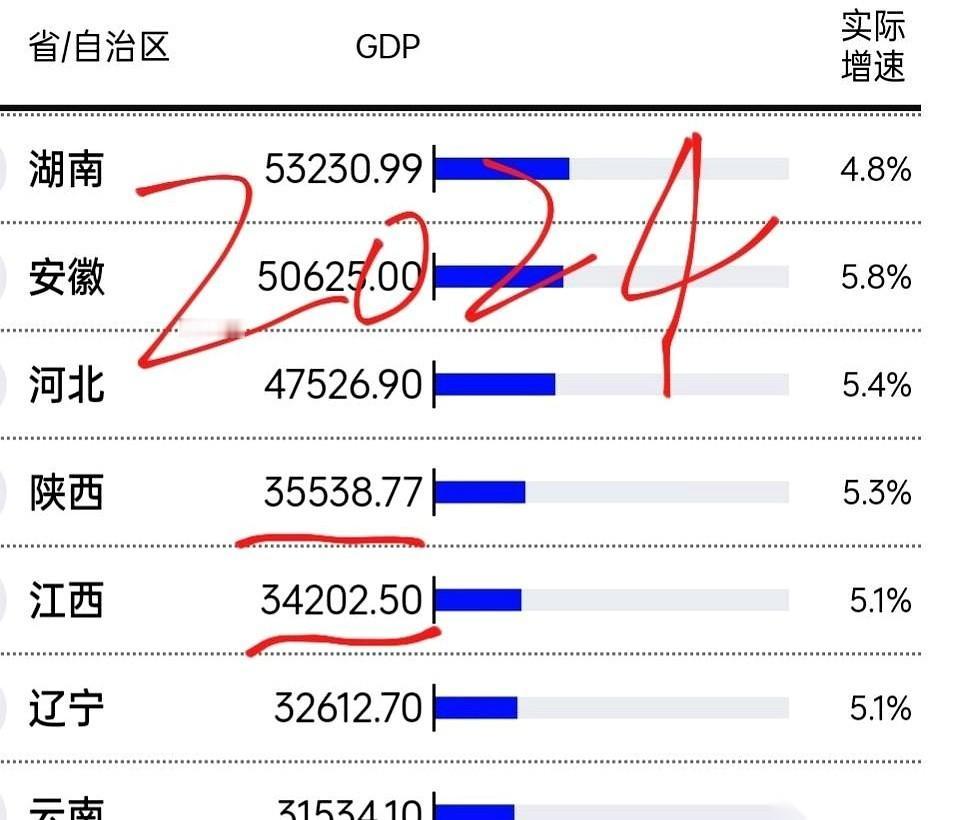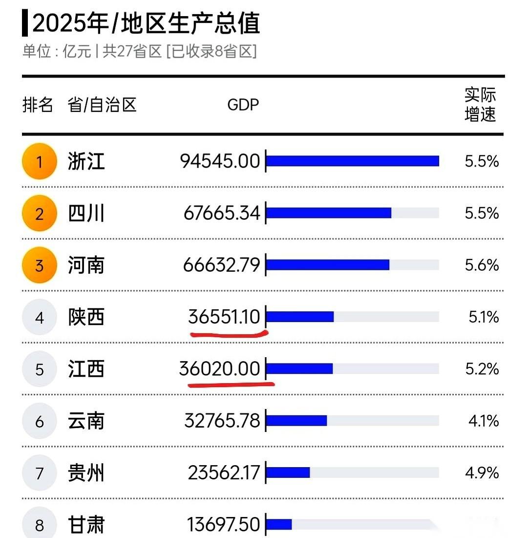 江西和陕西这场暗战,终于藏不住了。 一年前,陕西还稳稳领先1300个亿,一年后,这个数字被硬生生砍到了500亿。 就在1月22号上午,两边统计局几乎同时交卷。江西,36020亿。陕西,36551.1亿。 数字背后,是完全不同的心跳。 江西的增速是5.2%,反超了陕西的5.1%。更要命的是增量,一口气,江西全年多干出了1800个亿,而另一边的陕西,拼尽全力也只拿下了1100亿,一进一出之间,曾经那道看似遥远的鸿沟,几乎快被抹平了。 背后就两件事。 一是老家底,第二产业的齿轮转得飞快,增速踩到了5.6%。 二是新玩法,赣超出圈,南昌的各种活动把人往里拉,整个江西的文旅像是突然打通了任督二脉,硬是把第三产业也给盘活了。 所以,到底是江西这一年太猛,还是陕西真的慢了半拍?