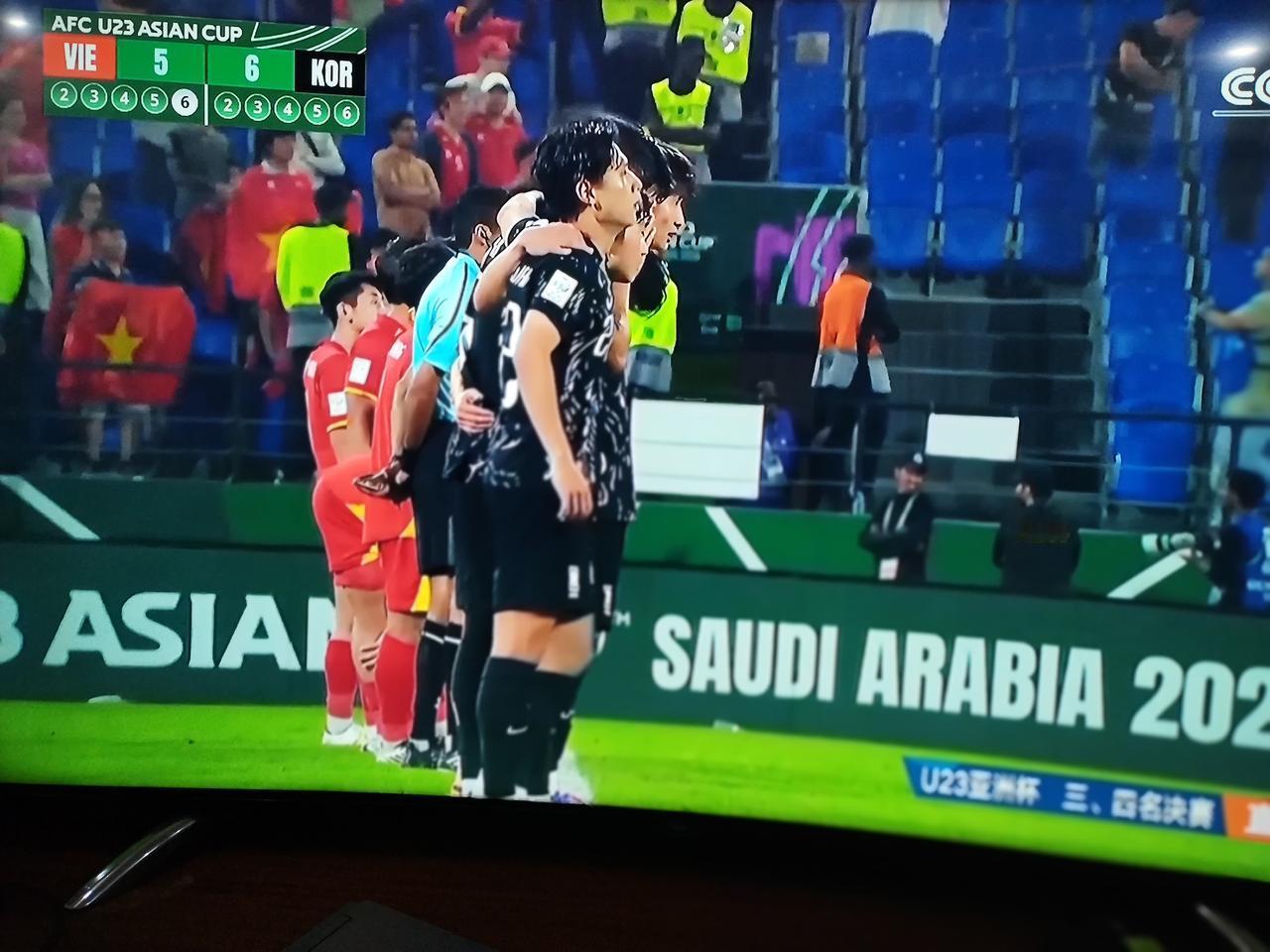 越南队太顽强啦!越南队点球大战7比6战胜韩国队,越南队以总比分9比8拿下韩国队,越南U23获得U23亚洲杯季军,韩国队获第四名! 越南队这场比赛太勇猛了,常规时间2次领先,85分钟阮庭北被红牌罚下,越南队少1人作战,可惜最后1分钟没有顶住,补时最后1秒钟被韩国队2比2绝平,加时赛,韩国队疯狂猛攻,越南队顽强顶了30分钟,韩国队始终无法破门,越南苦战120分钟,双方2比2握手言和,点球大战。 点球大战太精彩,双方前五名队员都全部命中,比分6比6,最神奇的是,越南队6名队员全部都罚右边,韩国守门员就是不信邪,非要扑左边,致使双方6比6打平,韩国队第7人罚被扑出,越南队第7名队员,终于罚了左边,韩国队守门员终于去扑右边,完美错过,球进了,越南队7比6赢了,越南队真的太不容易了,越南队今天晚上把输中国队的气全部撒在韩国队身上了,韩国队输越南国内媒体大概率要“炸天”了。