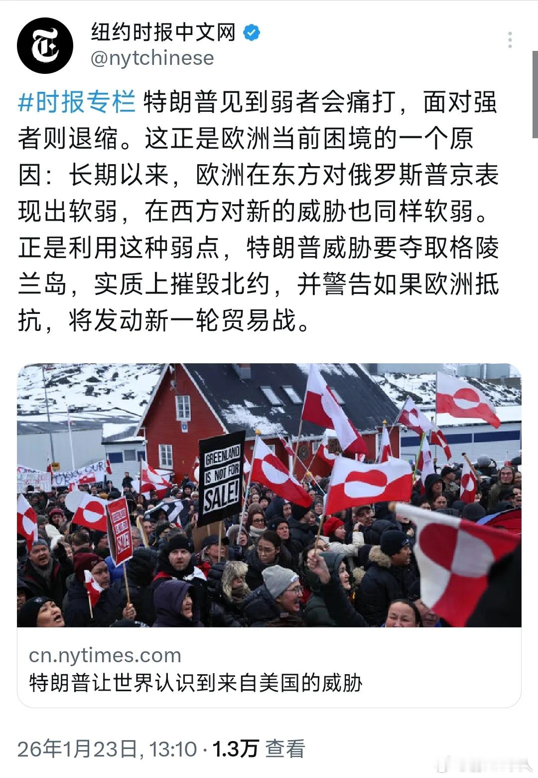 纽约时报:特朗普见到弱者会痛打,面对强者则退缩。这正是欧洲当前困境的一个原因:长期以来,欧洲在东方对俄罗斯普京表现出软弱,在西方对新的威胁也同样软弱。正是利用这种弱点,特朗普威胁要夺取格陵兰岛,实质上摧毁北约,并警告如果欧洲抵抗,将发动新轮贸易战。看美国现在表现,灯塔国信徒洗地都难。尤其欧洲还在叽叽歪歪说香港,这不是神经病么?
