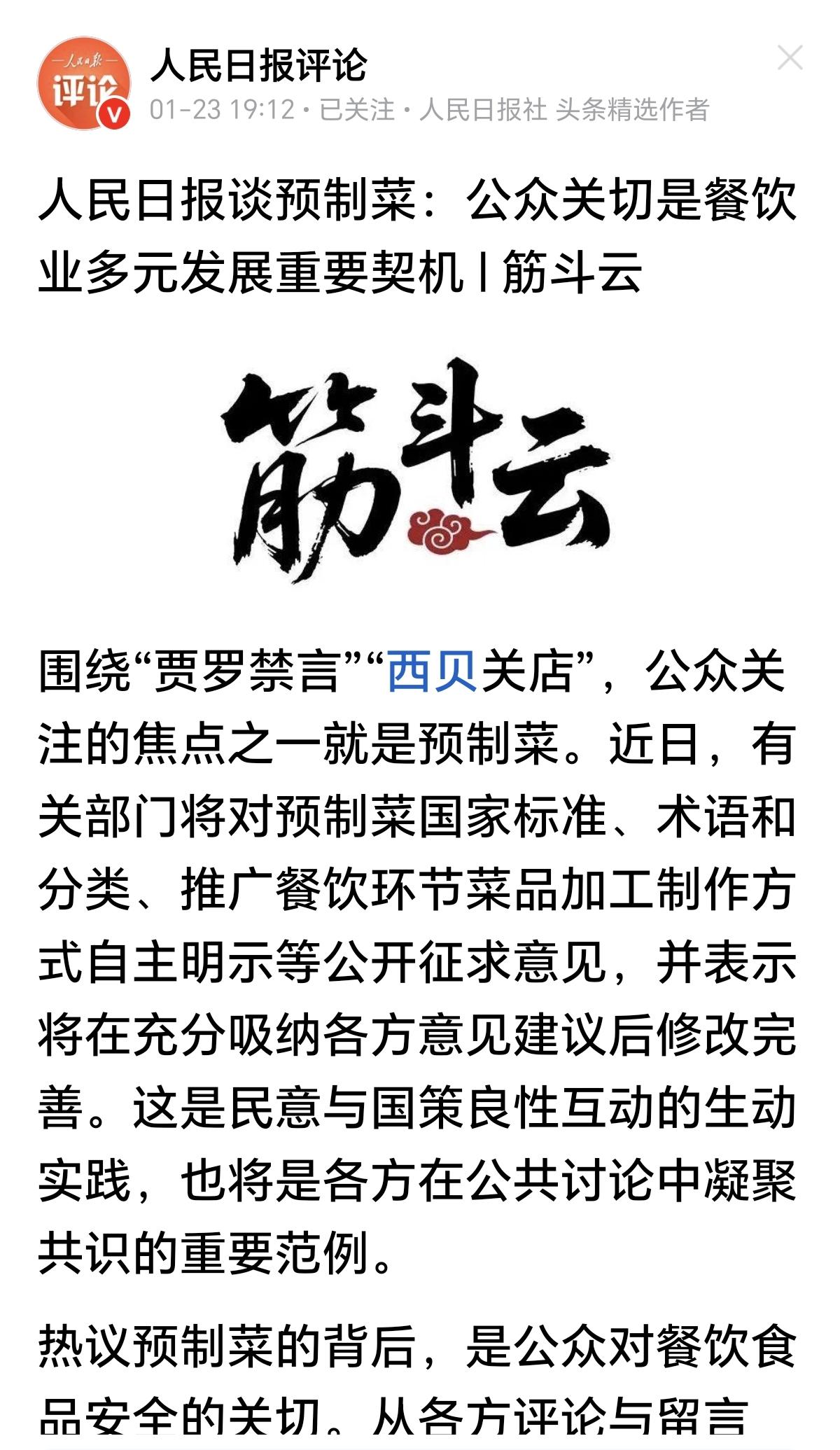官媒的第6篇评论还是来了!这次是站在广大消费者的角度谈餐饮业的发展契机,对预制菜给出了中肯的定位和建议:预制菜不是一切,消费者会用脚做出选择等观点,比较接地气。 昨天我还在说,官媒已经对“西贝事件”五连评了,本以为出场是来一锤定音的,结果是接着又“捶”了4下;本以为是看了一场精彩的电影,竟成了“连续剧”。 第6篇还是来了。 这次的观点比较中肯、接地气,是站在消费者的角度看问题的。 我觉得“贾老板们”看完这篇官媒评论或许要陷入沉思或难以入眠了。 预制菜不是一切,只是餐饮业多远发展的赛道之一; 消费者有权选择吃不吃预制菜;信息必须透明,该标注就要标注清楚,不能蒙混过关; 预制菜的特色就是便宜和高效。 我个人觉得,这次的核心观点和老罗当初的观点基本一致,符合大众对预制菜的基本认知。 我不知道贾老板这一次会不会在朋友圈转发,但确实够他消化一阵子了。 基于以上对预制菜的认知和定位,我对预制菜有两点建议。 一是,预制菜主要在快餐的赛道发展,主打就是价格低、高效。 二是,预制菜应该进商超,消费者买回去自己去加热,毕竟这些菜品对厨艺要求十分有限,有电磁炉、微波炉就能解决大部分问题。 想出去吃点特色菜品的,就不要选择预制菜了,“臣妾做不到”,那是强人所难了。