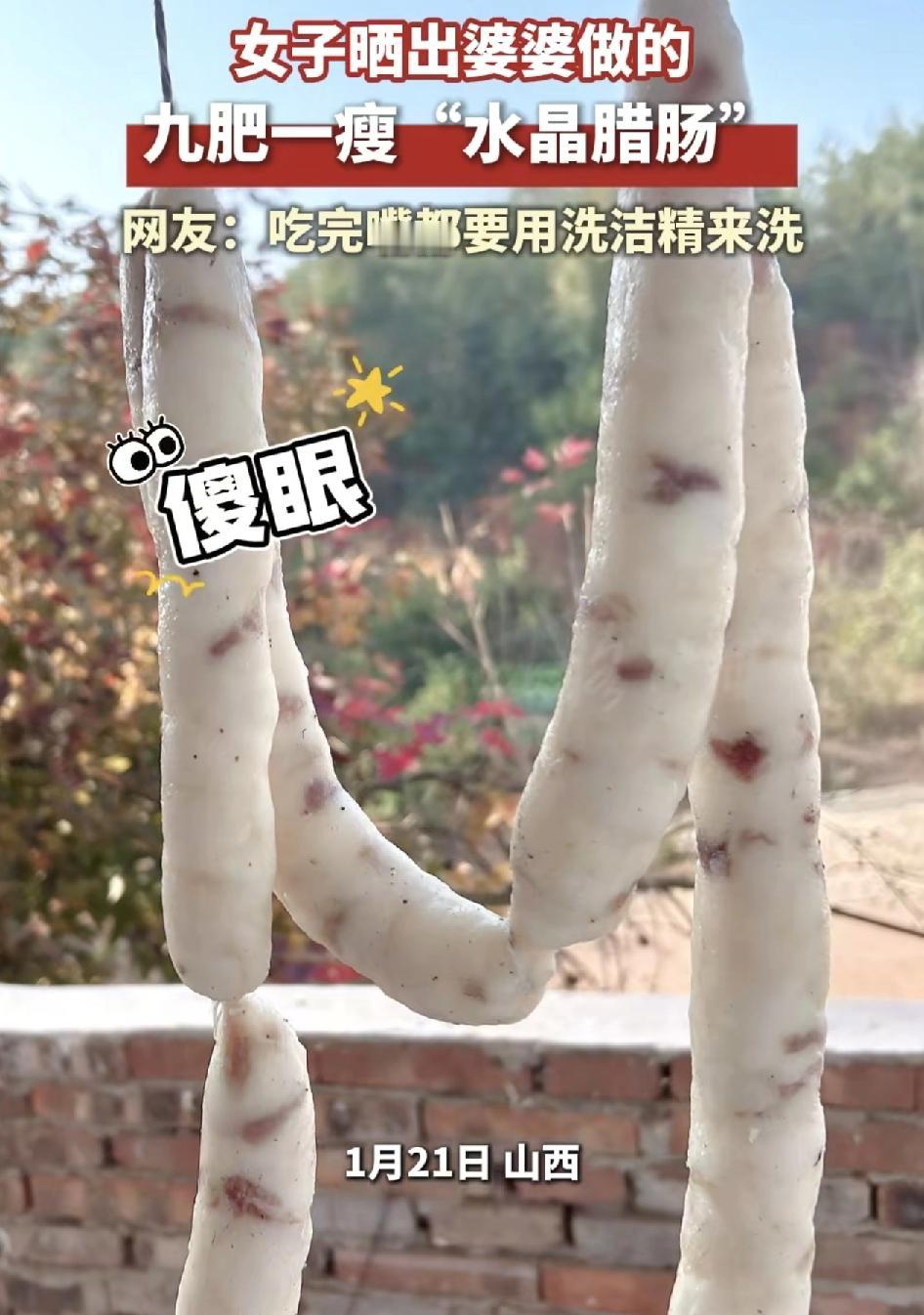 山西一女子晒出了婆婆做的九肥一瘦的腊肠,口味极其独特。看着网友们都觉得这口感也太腻了吧,通常来说,秋冬季晒腊肠,大家都喜欢选用七分瘦肉三分肥肉,这样的搭配口感才是最好的,因为这样做出来的腊肠,即便不用配饭菜吃,也是味道极好的,但是90%都是肥肉,这样的腊肠能吃几口,让大家都特别的傻眼。只能说这样的腊肠用来炒菜的口感会比较好。