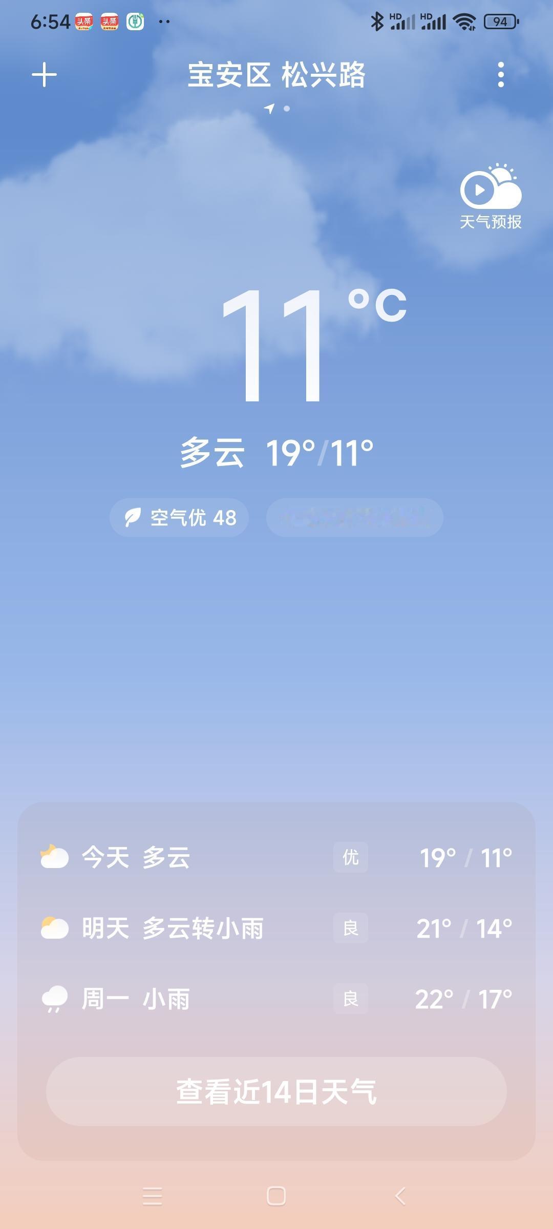 我的今日状态:😁轻松愉快 我这里的天气:🌤️多云!深圳今日多云,气温11度到19度,湿度71度,大家早上好,周末愉快![作揖]