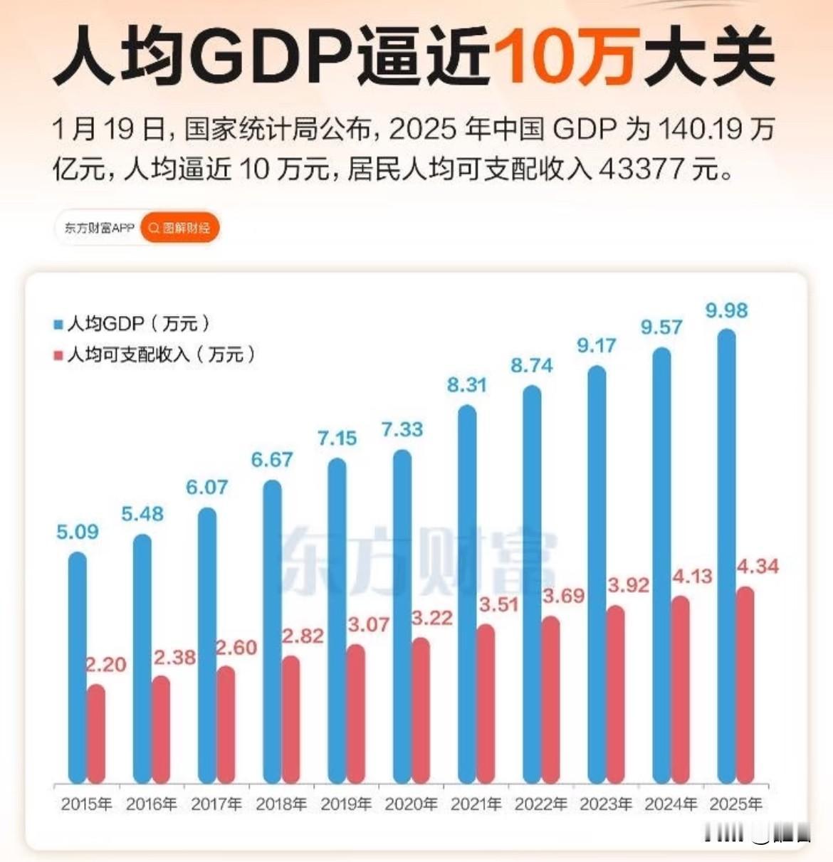 我国人均GDP逼近10万元大关! 刚刚发布的2025年经济数据和人口数据显示,GDP总额突破140万亿元、人口总量14亿人,折合下来人均GDP为10万元(实际为9.98万元)。 众所周知,GDP是国民创造的产值,不是你的收入,越高说明你为社会创造的财富越多,至于体感嘛,大多数人被平均的概率比较大………