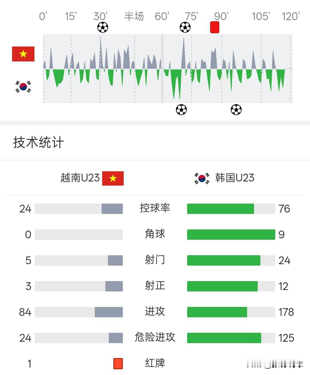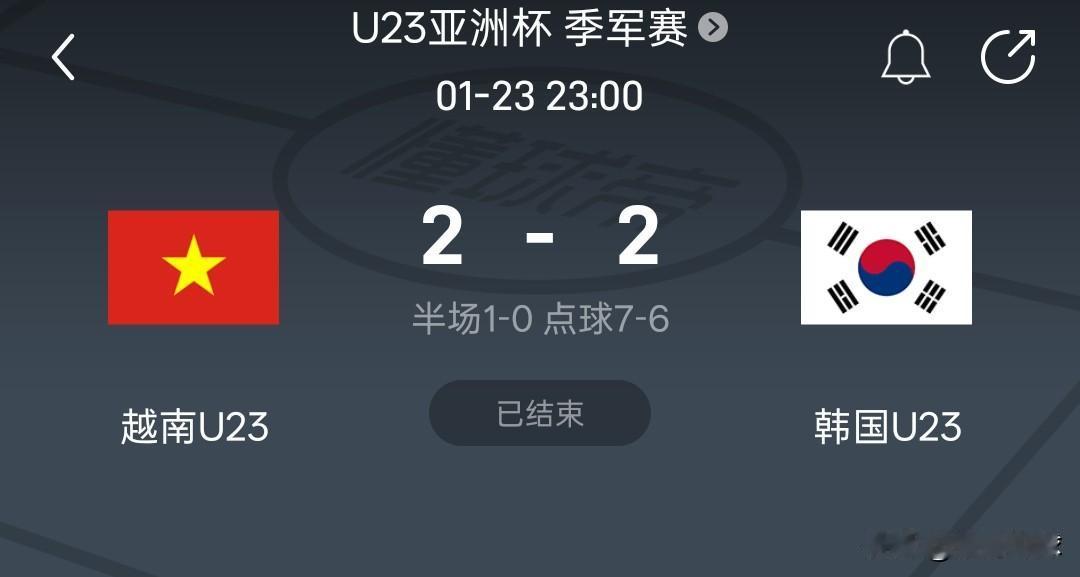 越南点球7-6战胜韩国,越南队获得U23亚洲杯季军,比赛过程和中国对乌兹别克斯坦一样,越南队只有24%的控球率赢下比赛。 韩国队全场压着打,轰出24次射门没能赢下比赛,越南队7人主罚点球全部命中,进入点球大战,处于弱势一方会占心理优势。