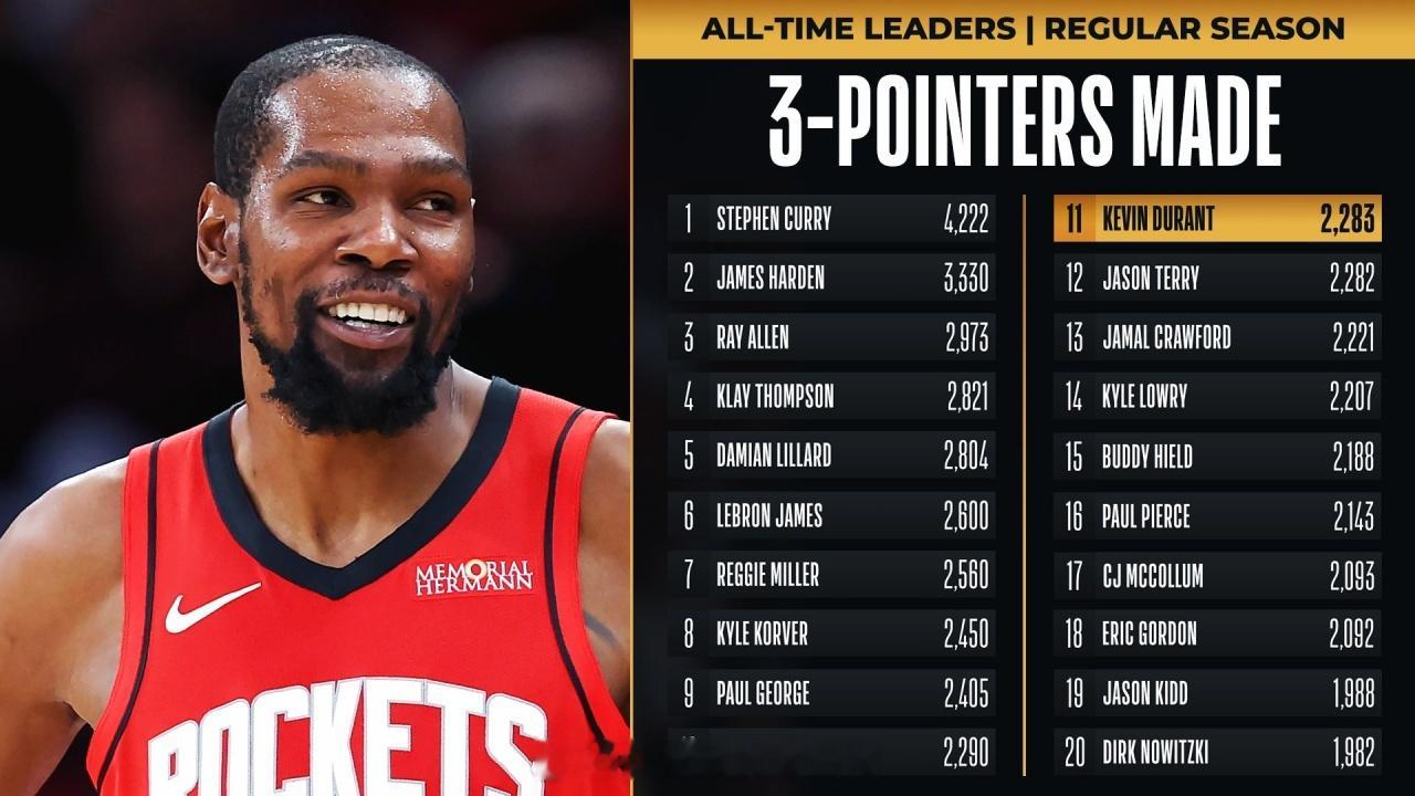 火箭vs活塞 杜兰特命中两记三分,生涯三分数来到2283个,超越贾森·特里,升至NBA历史第11,排在第10的是文斯·卡特(2290个)。