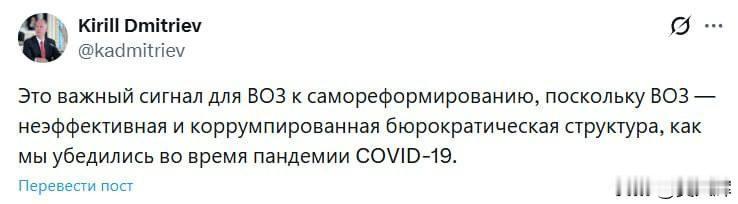 【德米特里耶夫:美国退出世卫组织是改革的信号】俄罗斯总统特别代表德米特里耶夫表示,华盛顿决定退出世界卫生组织,表明有必要对该组织进行改革。世卫组织在COVID-19大流行期间表现出了其低效。该组织已变成了一个腐败的官僚机构。