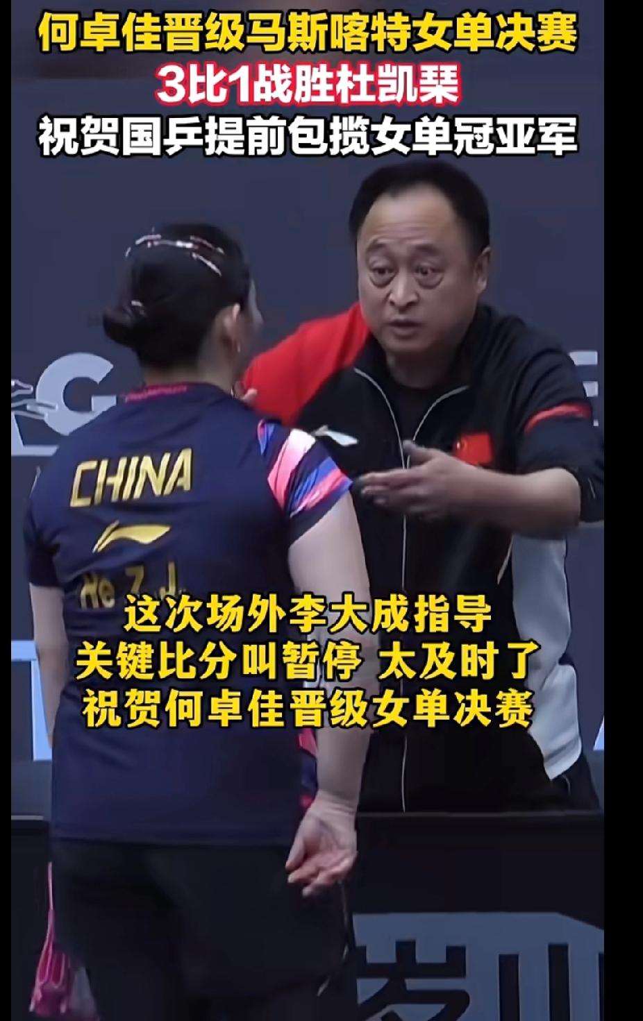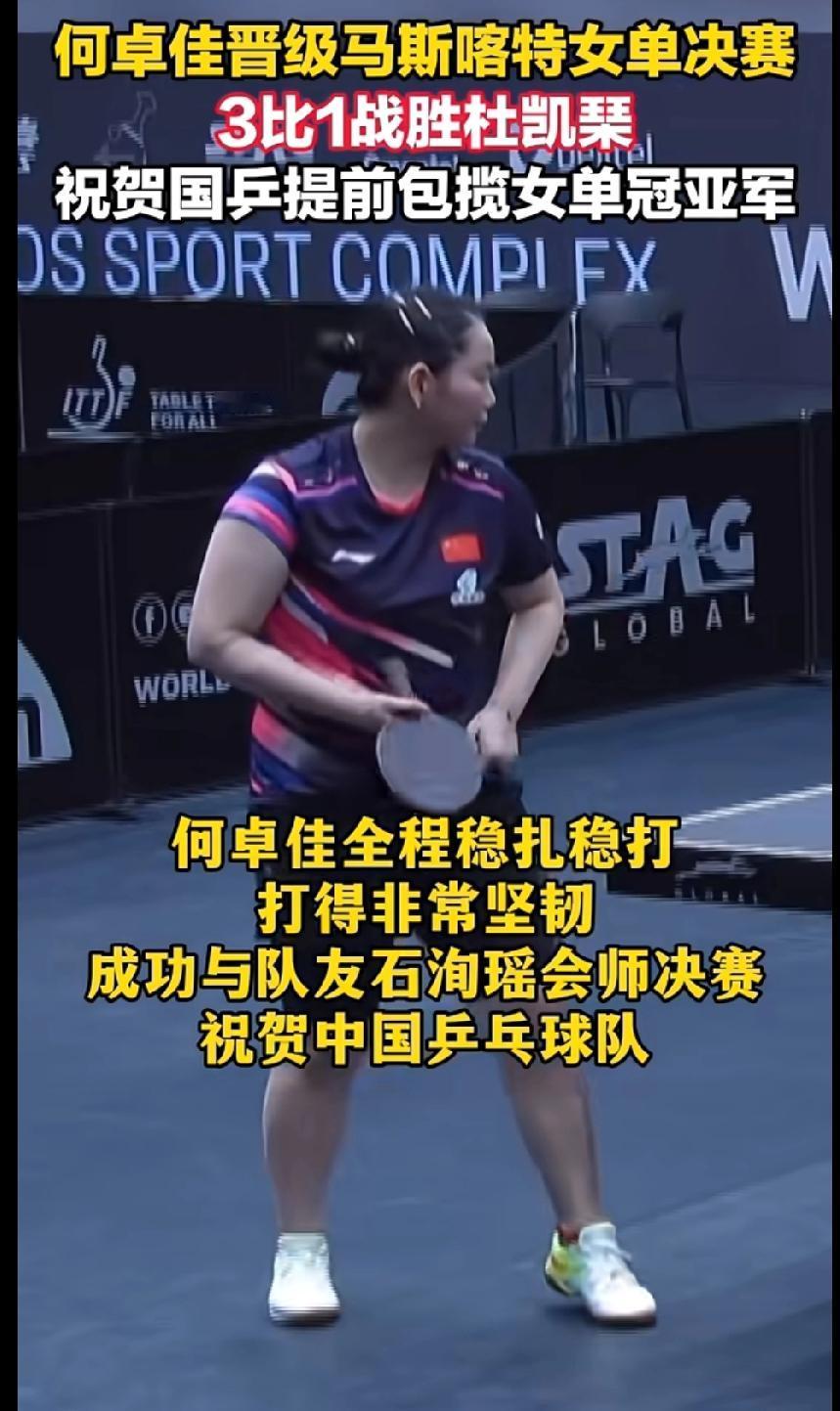 何卓佳杀进决赛!国乒提前包揽冠亚军,莎宝的好闺蜜太给劲儿了💪 家人们,何卓佳这波真的稳! 3比1拿下杜凯琹,和队友石洵瑶会师决赛,国乒直接把女单冠亚军都锁死了! 说起来,佳佳可是孙颖莎从小一起长大的好闺蜜,俩人感情好得没话说。 今天佳佳全程稳扎稳打,李大成指导关键时候的暂停也叫得太及时了,这师徒配合绝了! 反正决赛都是咱中国队的,谁拿冠军都开心,就是真心为佳佳高兴,希望她能在决赛里放开打,拿下属于自己的高光时刻✨ 何卓佳晋级马斯喀特女单决赛