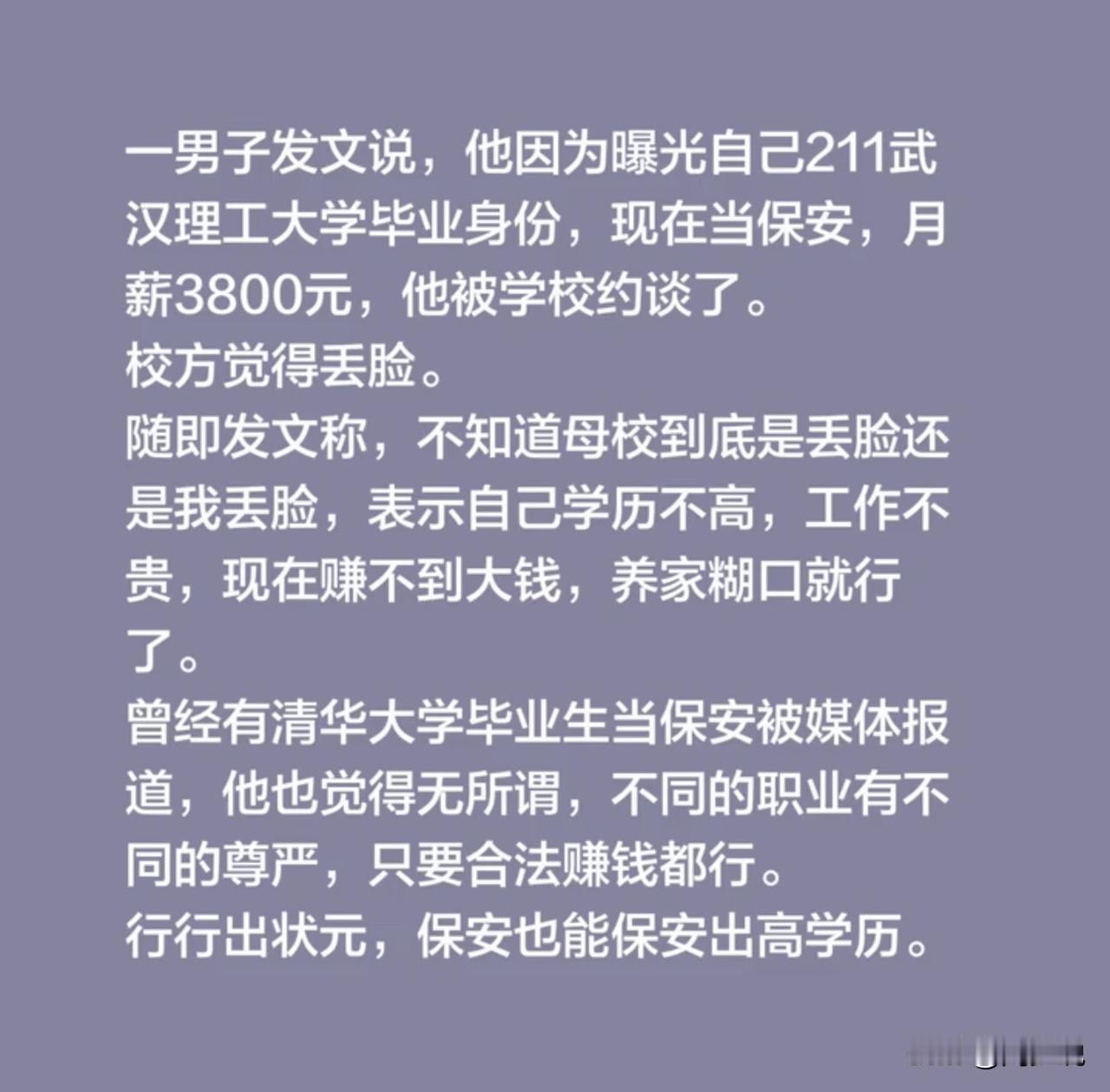 “真是骇人听闻!”武汉理工大学一名211毕业生,因曝光自己当保安、月薪3800元的现状,竟被母校约谈,校方直言此举“丢脸”。该毕业生无奈发声:学历不高、工作不贵,现在赚不到大钱,不过是养家糊口,何丢脸之有? 此事引发网友热议,有人说:“职业无高低,凭本事吃饭不丢人,母校格局小了!” 也有人感慨:“名校标签不该是枷锁,毕业生有权选择自己的生活。” 在周少看来,这场“丢脸”之争,其实恰恰戳中了社会对学历与职业的偏见。名校培养的是独立人格与生存能力,而非必须光鲜亮丽的“面子工程”。该毕业生放下身段靠劳动谋生,坦荡又踏实,远比那些眼高手低、好逸恶劳的人更值得尊重。 母校的约谈,本质上是把学历当成了炫耀的资本,却忽略了职业平等的内核。三百六十行,行行出状元,只要脚踏实地、合法谋生,任何职业都值得被尊重。 用一句话来说,职业不分贵贱,靠自己勤劳的双手赚钱,真的一点都不丢人。大家应该放下偏见,给予极大的包容和尊重,要不是迫不得已,谁愿意当保安呢?#寻美三湘# #长沙新朋友#