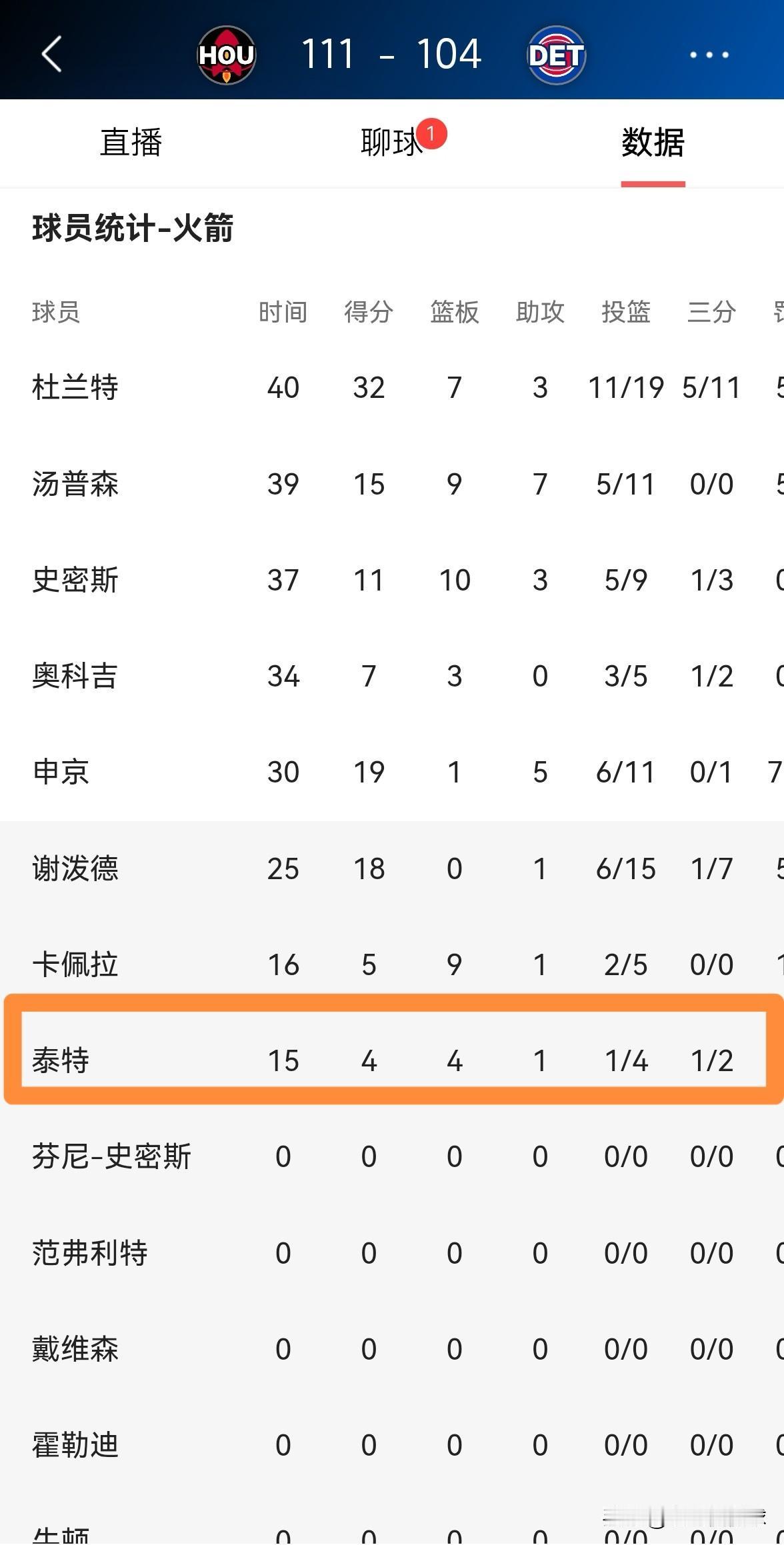我强烈建议火箭主帅乌度卡增加泰特的上场时间!在今天火箭客场以111:104战胜活塞的比赛中,泰特在伊森、芬尼-史密斯缺阵的情况下获得了出场机会,他在替补出战的15分钟里,投篮4中1,其中三分球2中1、罚球2中1得到4分4篮板1助攻,不过有3次失误和3次犯规,他的场上正负值为+3。 实事求是的说,如果泰特能够持续的获得稳定的上场时间,那么他在攻防两端的效果不比芬尼-史密斯差,可惜的是火箭主帅乌度卡在无人可用的情况下才会启用泰特。