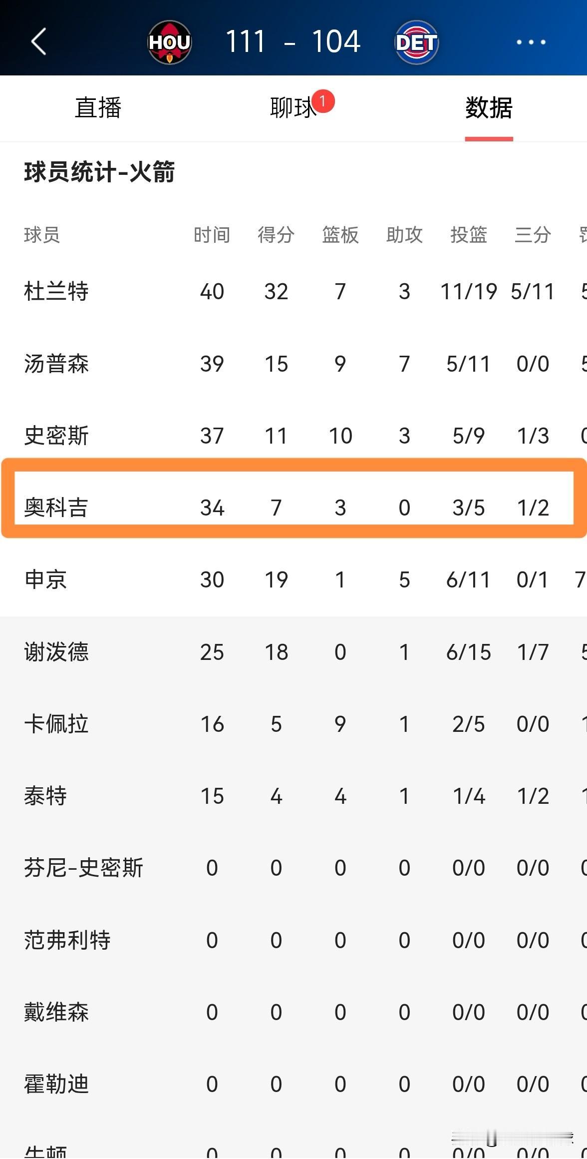 火箭悍将奥科吉真是活该被乌度卡教练重用!在今天火箭客场以111:104战胜活塞的比赛中,奥科吉获得了多达34分钟的上场时间,投篮5中3,其中三分球2中1非常高效的得到7分,还有3篮板2抢断,他的场上正负值为+1。 老实说,以奥科吉在本场比赛中的出色表现来看,他绝对对得起自己的年薪,像奥科吉这种性价比超高的球员,活该他被乌度卡教练重用。