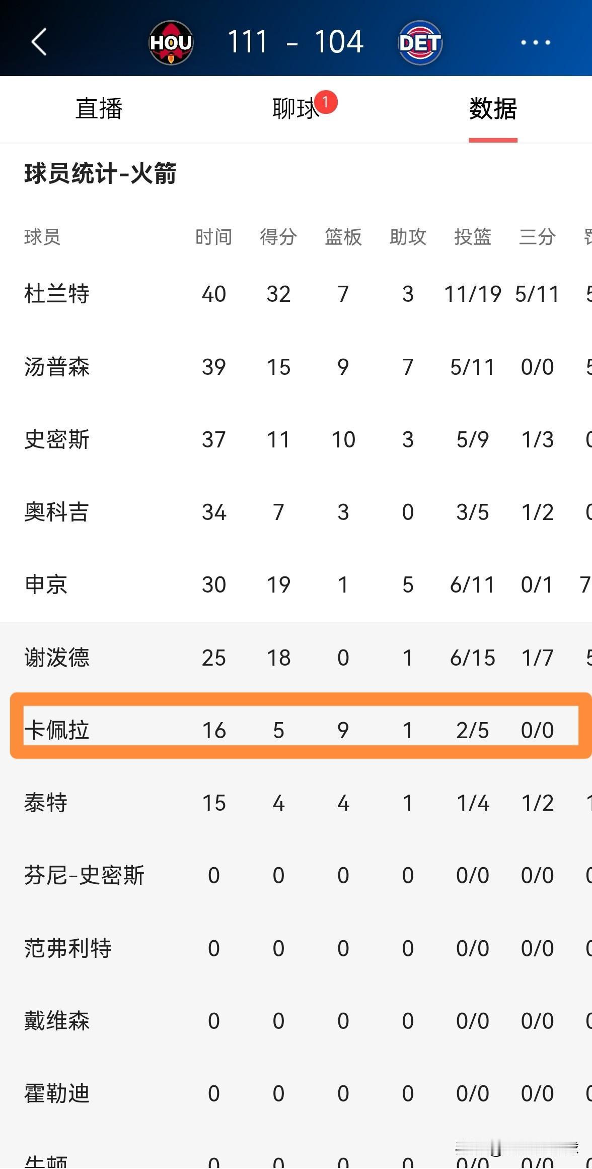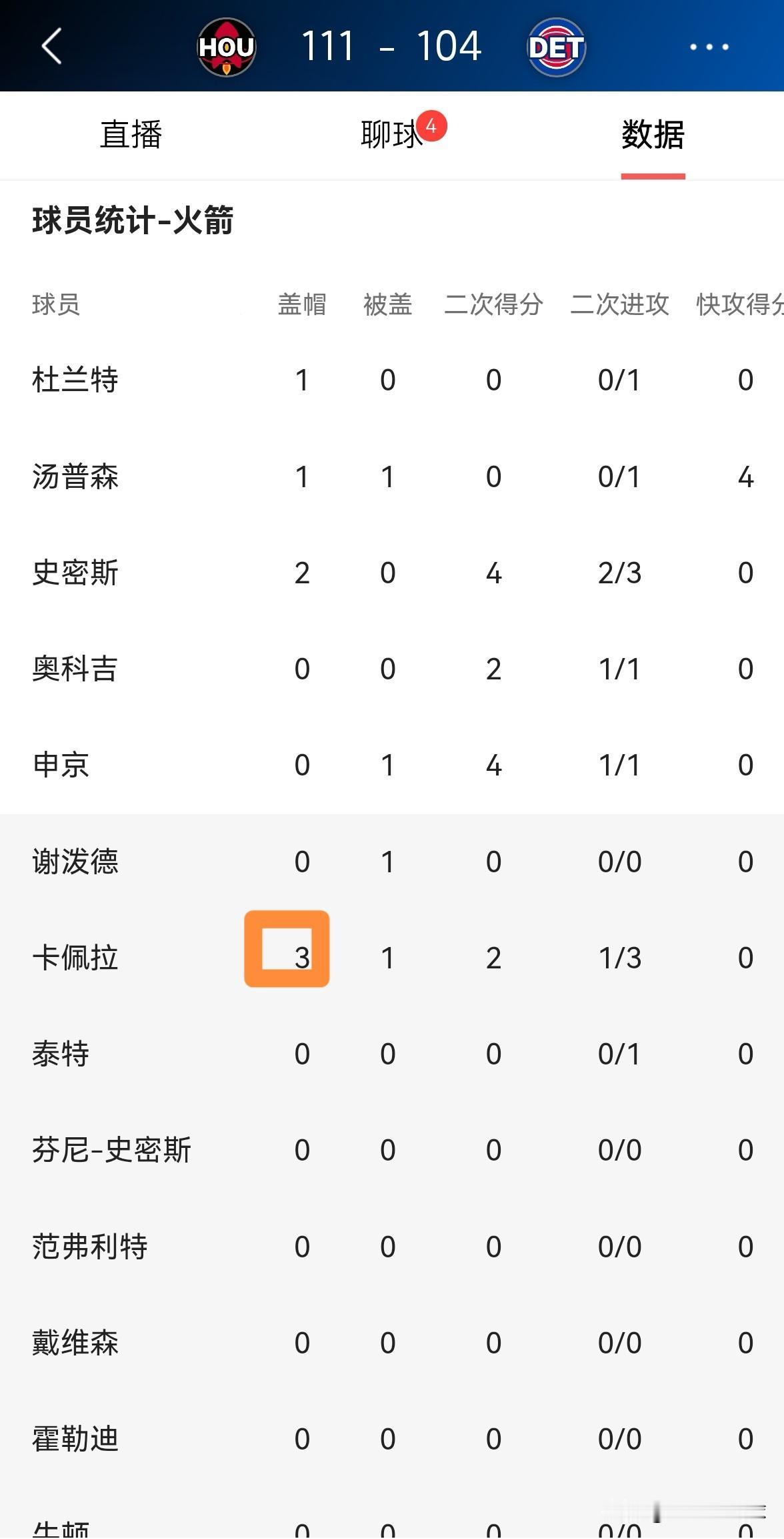 火箭老将卡佩拉真是太玩儿命了,他疯狂的送出3记盖帽。在今天火箭客场以111:104击败活塞的比赛中,卡佩拉在防守端打出了极具说服力的表现。 全场比赛下来,卡佩拉替补出战16分钟,投篮5中2,其中罚球2中1得到5分9篮板1助攻1抢断,还有不可思议的3盖帽,他的场上正负值为+6。 本场比赛,虽然火箭当家中锋申京在防守端表现疲软,但是老将卡佩拉却极具侵略性,他真是太拼命了。