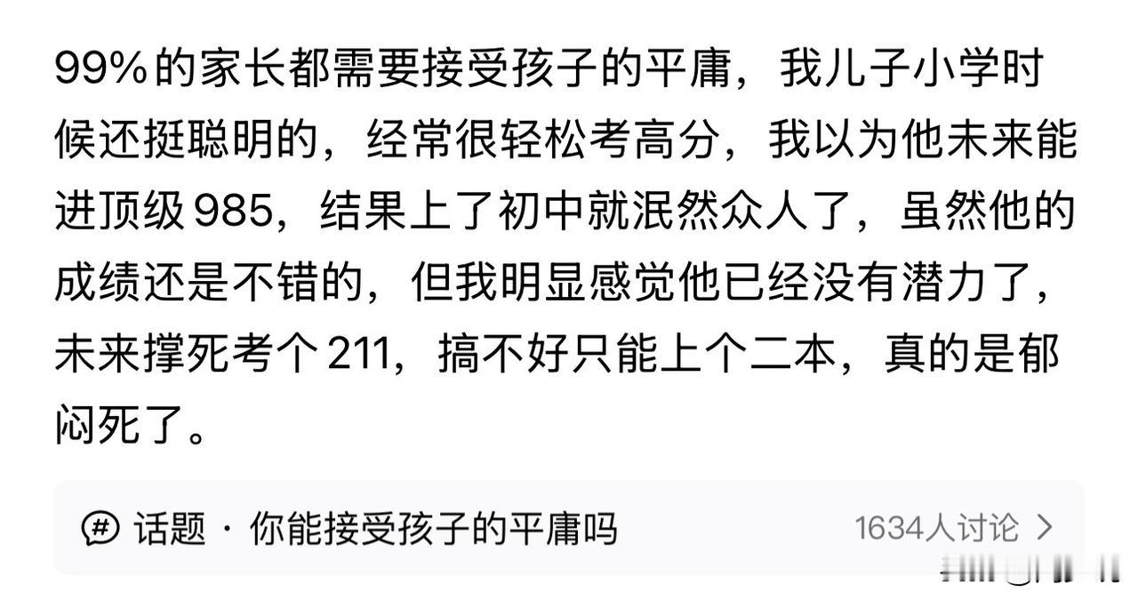 周少觉得这位家长还是挺清醒的,能欣然接受孩子的平庸。其实,很多家长都陷入了“神童滤镜”的误区,把孩子的一时亮眼当成了终身高光。 实际上,每个孩子都有其成长的节奏,有的孩子开窍早,有的孩子厚积薄发,还有的孩子注定平凡却自有闪光点。 与其逼着孩子活成我们期待的样子,不如蹲下来看看他真实的模样。接受孩子的平庸,不是躺平放弃,而是卸下彼此的枷锁,让他在自己的赛道上从容生长。 毕竟,比起名校光环,心理健康、人格健全才是孩子一生的底气。#寻美三湘# #长沙新朋友#