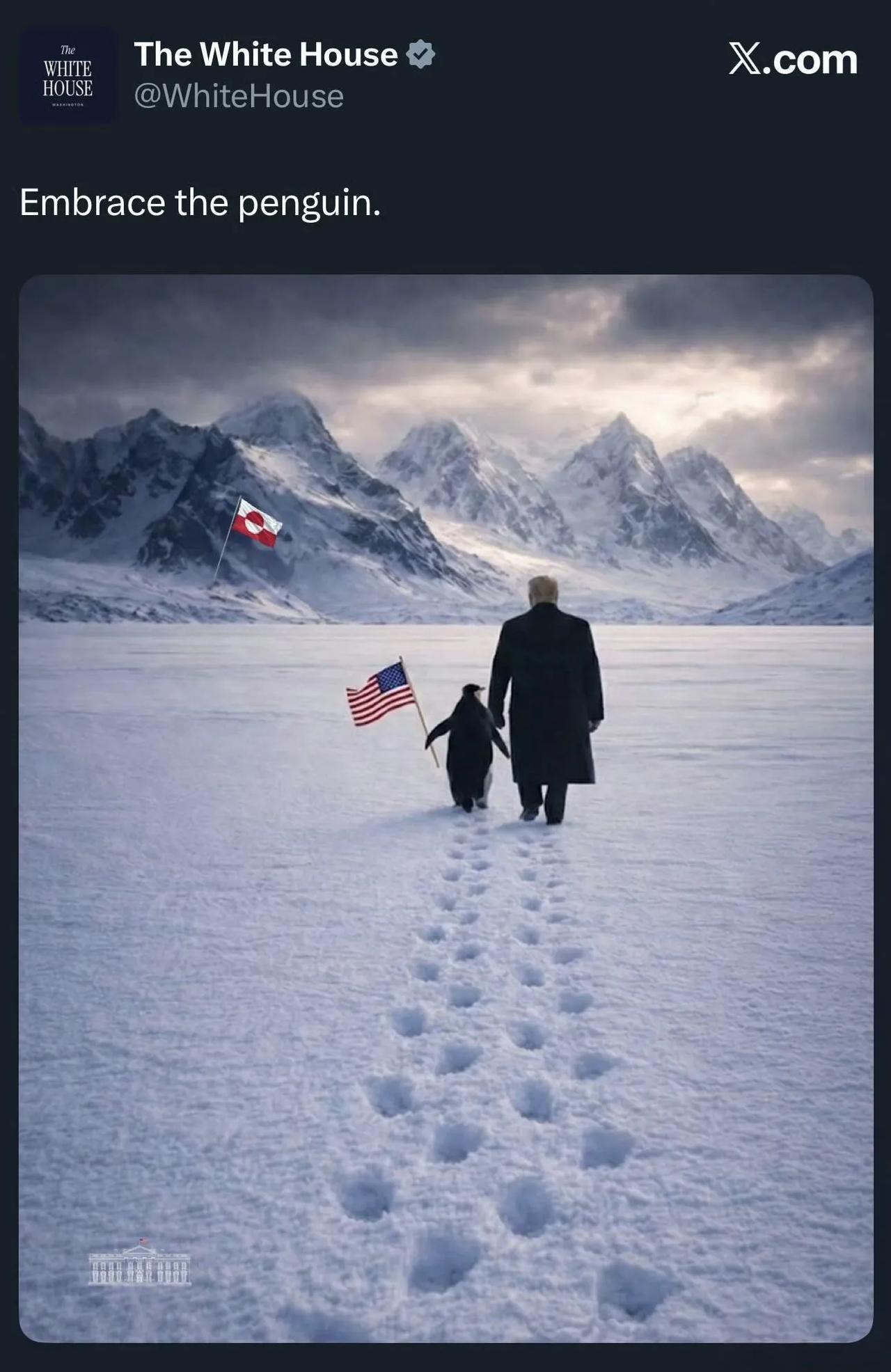 美国白宫已经彻底成为给老特歌功颂德的大喇叭,极尽谄媚。这幅画尽管槽点不少,但是传递的信号非常清晰,就是老特为美国吞并格陵兰岛的心思没有变。 画面中老特拉着的并非企鹅,而是早已灭绝的北极大海雀。白宫虽然住着特不靠谱,但还不至于在作画的时候一点儿常识都不懂。 penguin,英文最初的意思是指北极大海雀。但是在18世纪到19世纪中叶之前,欧洲人对北极大海雀滥捕滥杀,最终导致其在1844年彻底灭绝。直到欧洲人在南极发现与北极大海雀外形相似的企鹅后,不用造词,直接就用penguin称呼企鹅。 这幅画除了寓意美国吞并格陵兰岛,还有暗讽欧洲残暴而老特是救世主之意。北极大海雀是欧洲人灭绝的,但是当老特来到格陵兰岛上,北极大海雀都复活了,摇着美国国旗和老特亲亲爱爱[笑哭] 然而在画面中,北极大海雀和老特在雪地上留下的足印几乎是一样的,这就很难绷。格陵兰主权危机