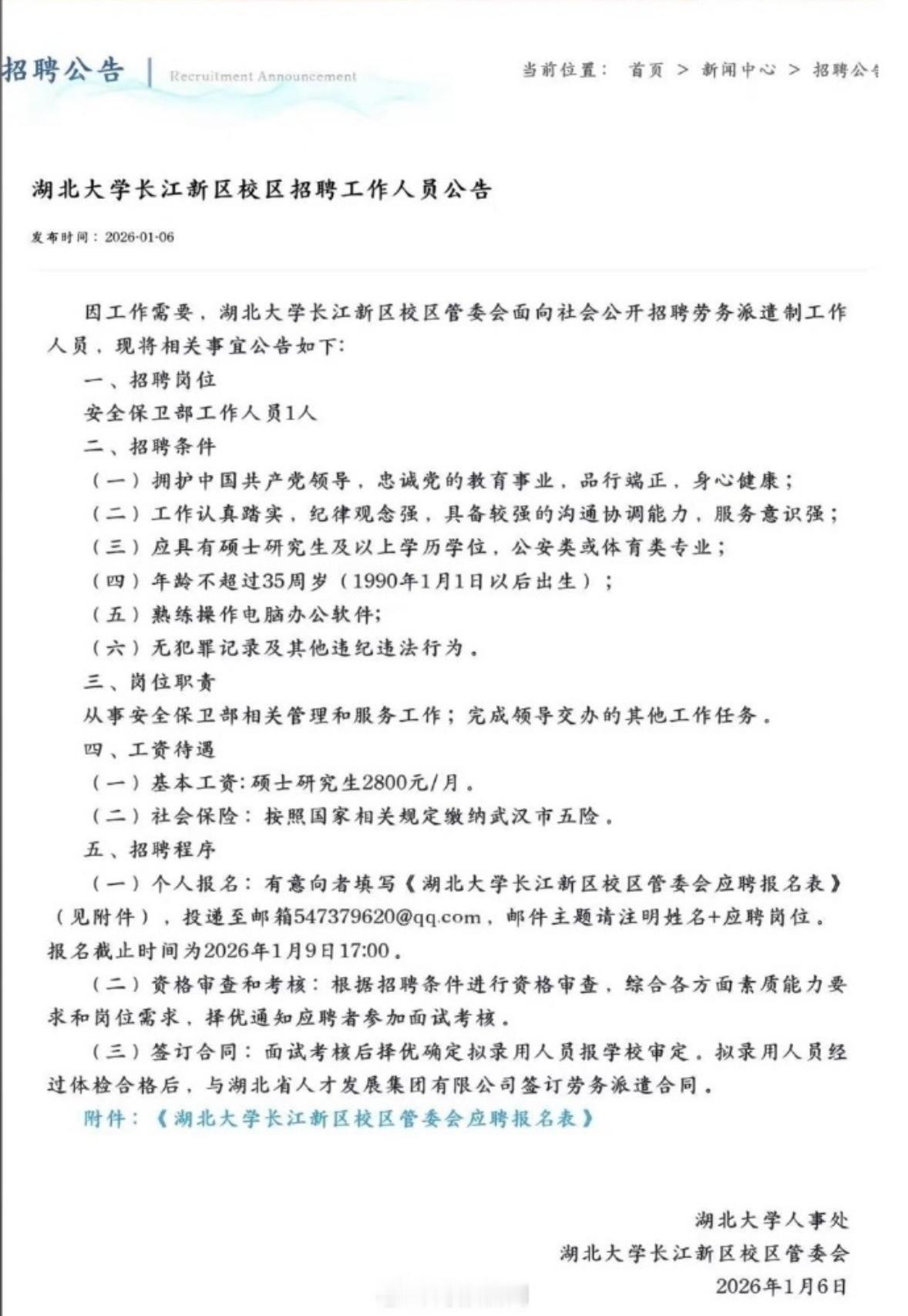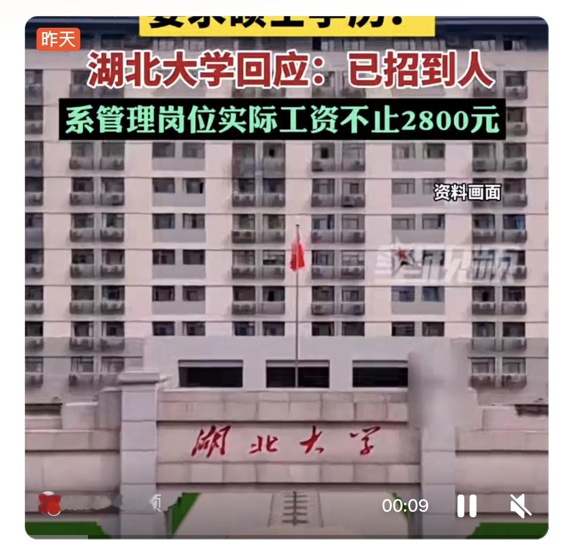 湖北大学一则安全保卫部工作人员的招聘公告引发热议。近日,湖北大学一则安全保卫部工作人员的招聘公告引发热议,该公告要求应聘者需具备硕士及以上学历,标注的基本工资却仅2800元。对此校方回应,该岗位已完成招聘,实际为管理岗,薪资待遇并非公告中所示的2800元。