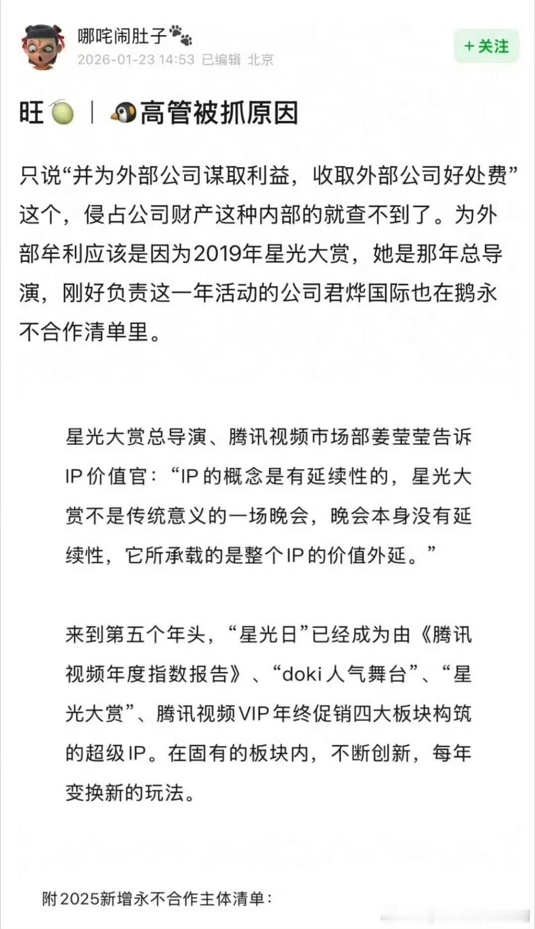 原来姜莹莹被抓的是因为线下活动啊,怪不得今年星光大赏这么寒酸呢🤣媒体们别拉别的剧共沉沦了,耽误人吃瓜制片人姜莹莹被解聘永不录用