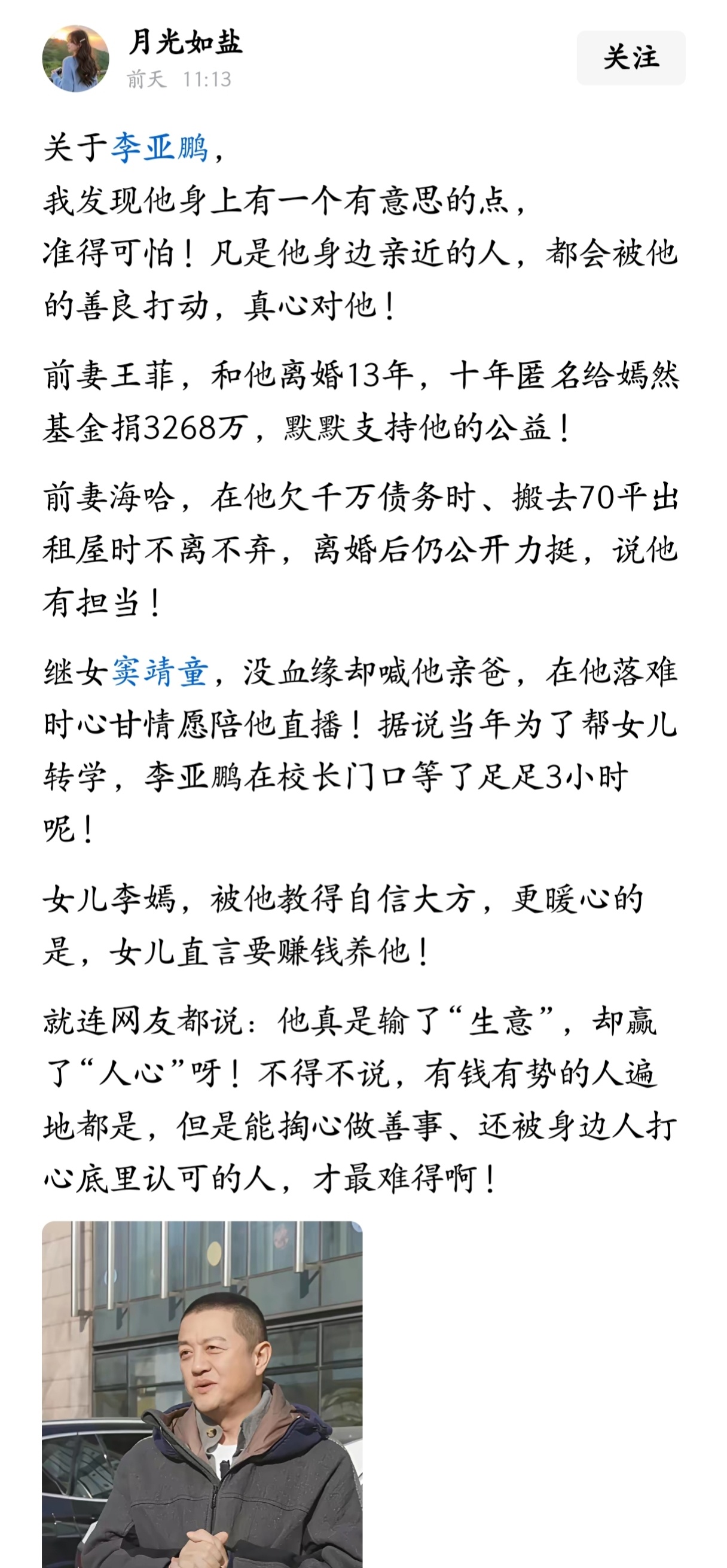 李亚鹏输了“生意”,却赢了“人心”,有钱有势的人遍地都是,但是能掏心做善事、还被身边人打心底里认可的人,才最难得。