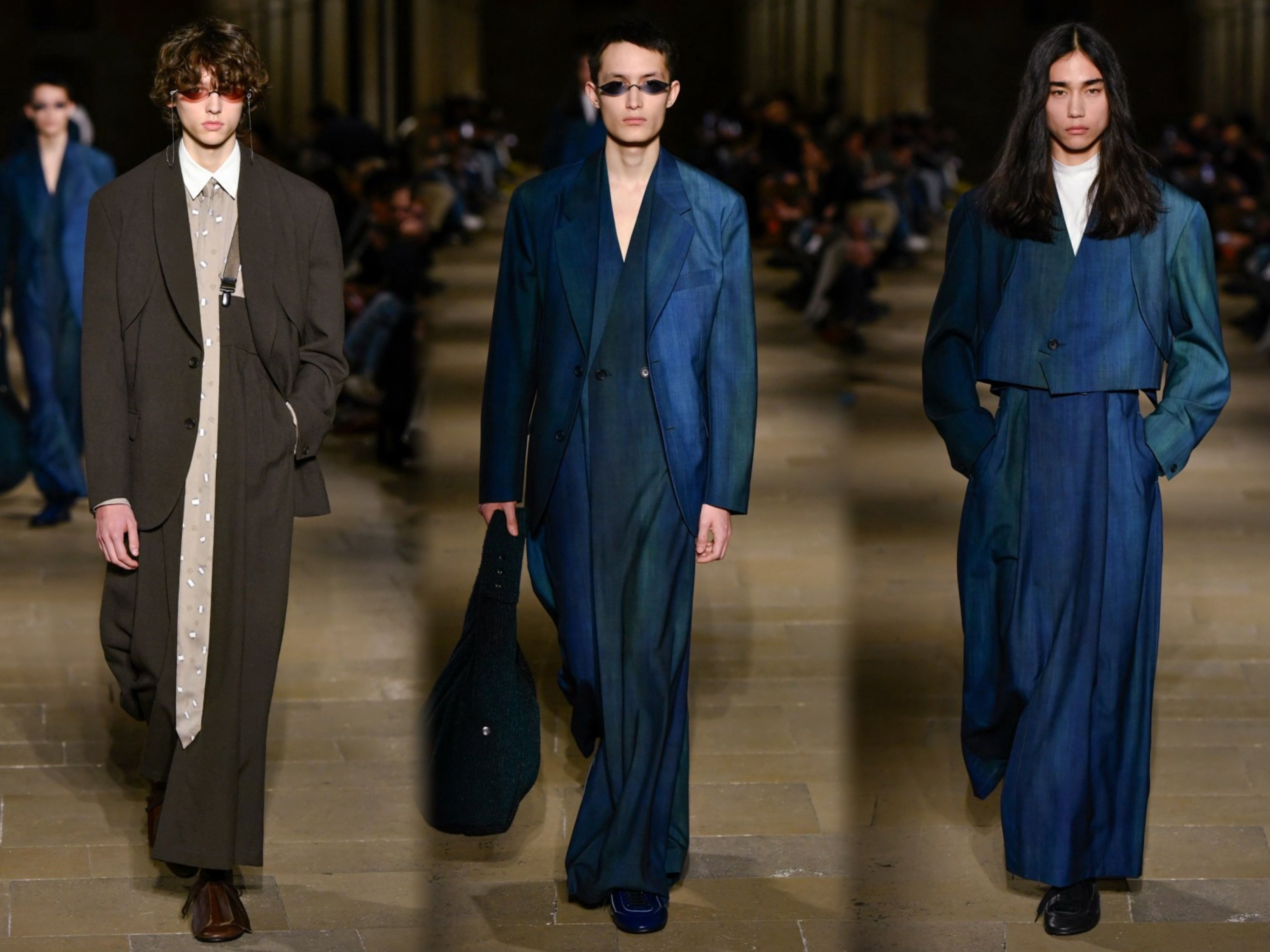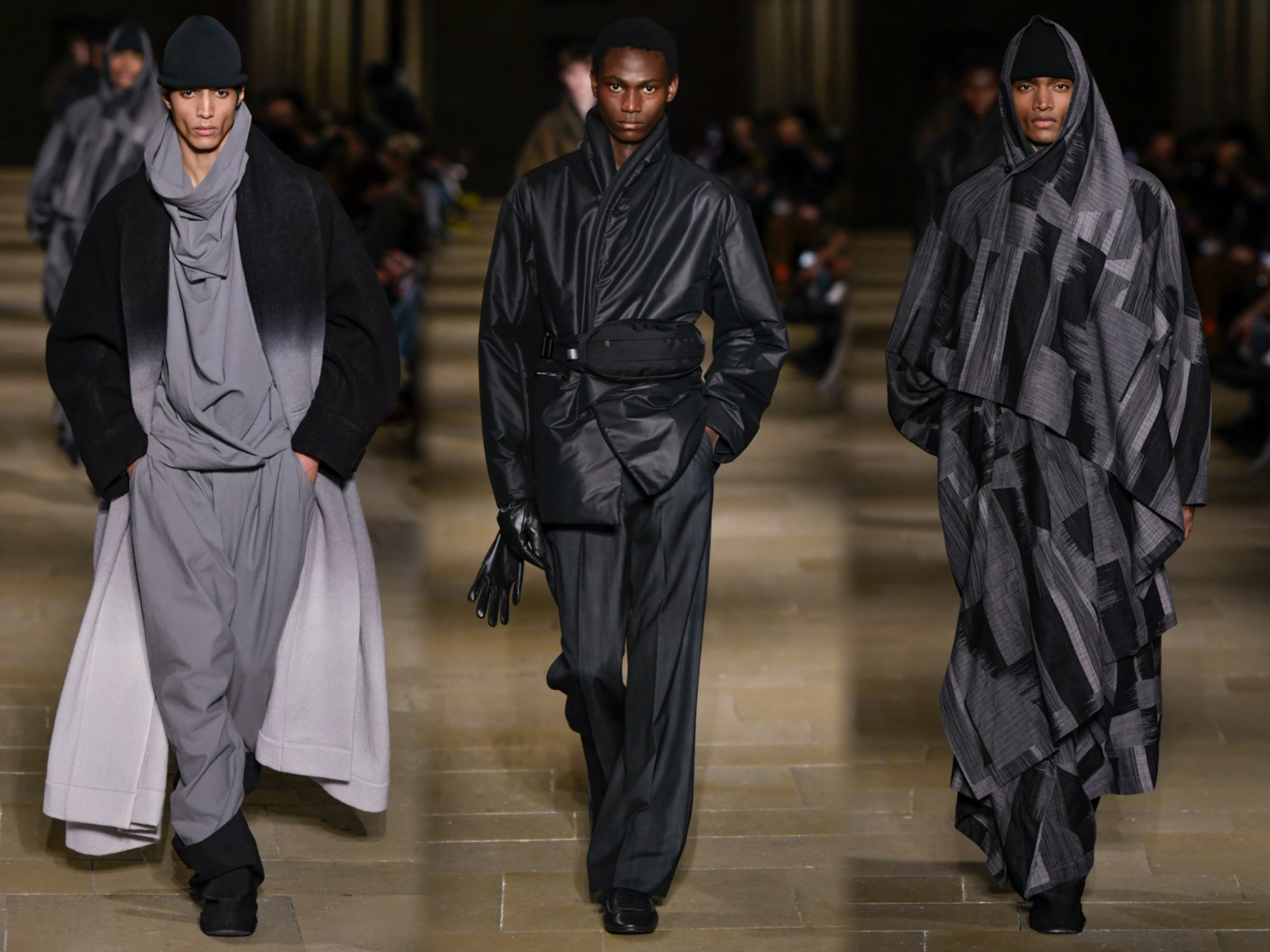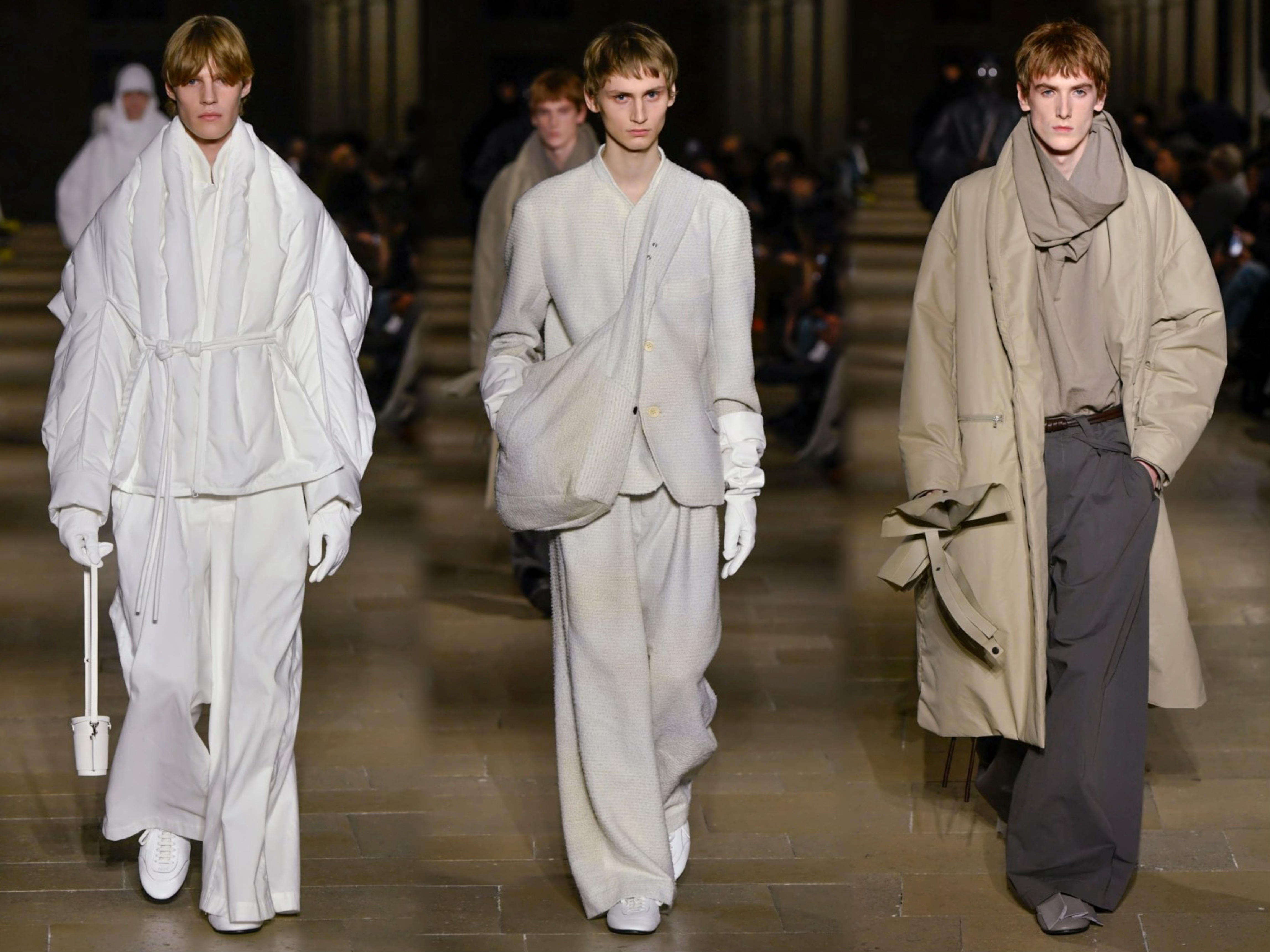 IM Issey Miyake Men Fall 2026 巴黎男装周 三宅一生秋冬男装以"无形之形"(Formless Form)为主题,延续极简廓形与褶皱工艺,通过层叠布料和流畅剪裁探索"流动与固定"的边界。深色系开场过渡到浅蓝、陶艺纹理的渐变色调,隐喻精神澄澈的过程,静谧诗意的东方冥想。男装周