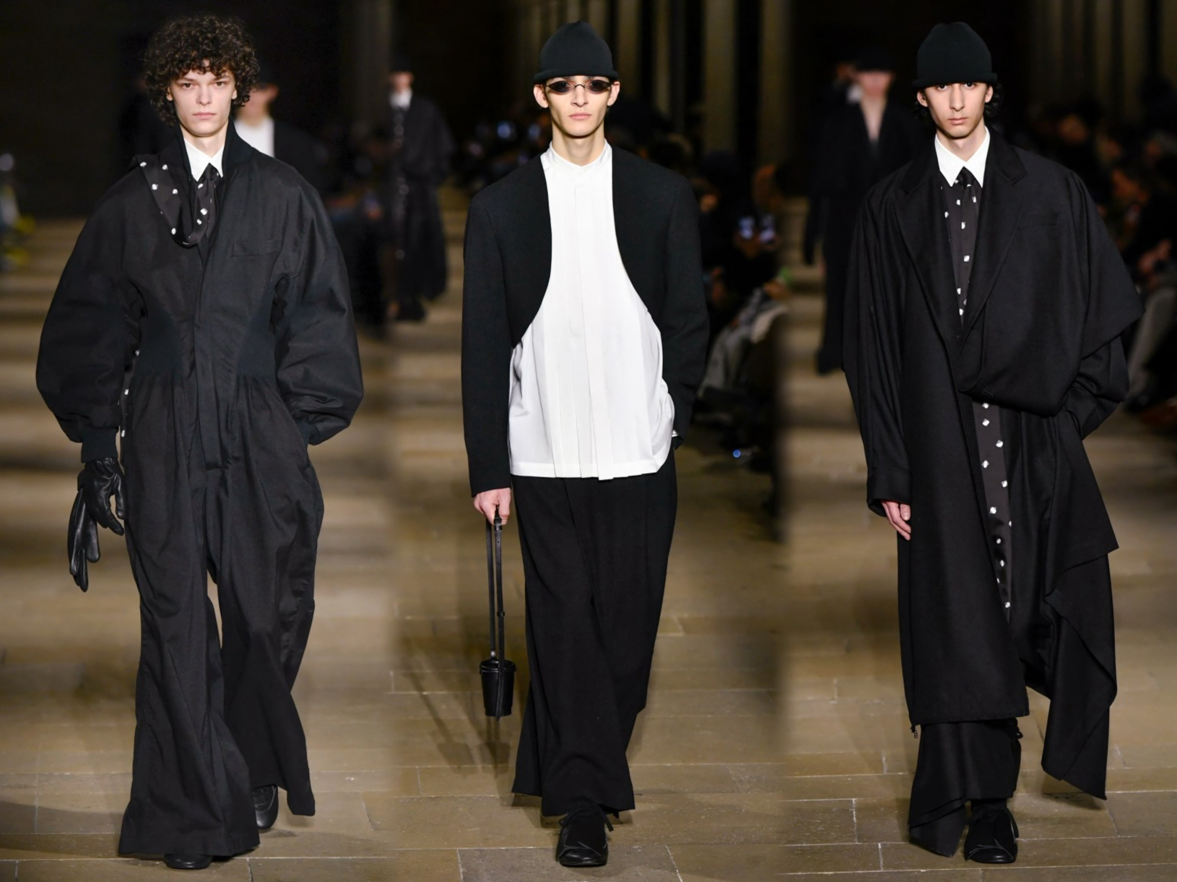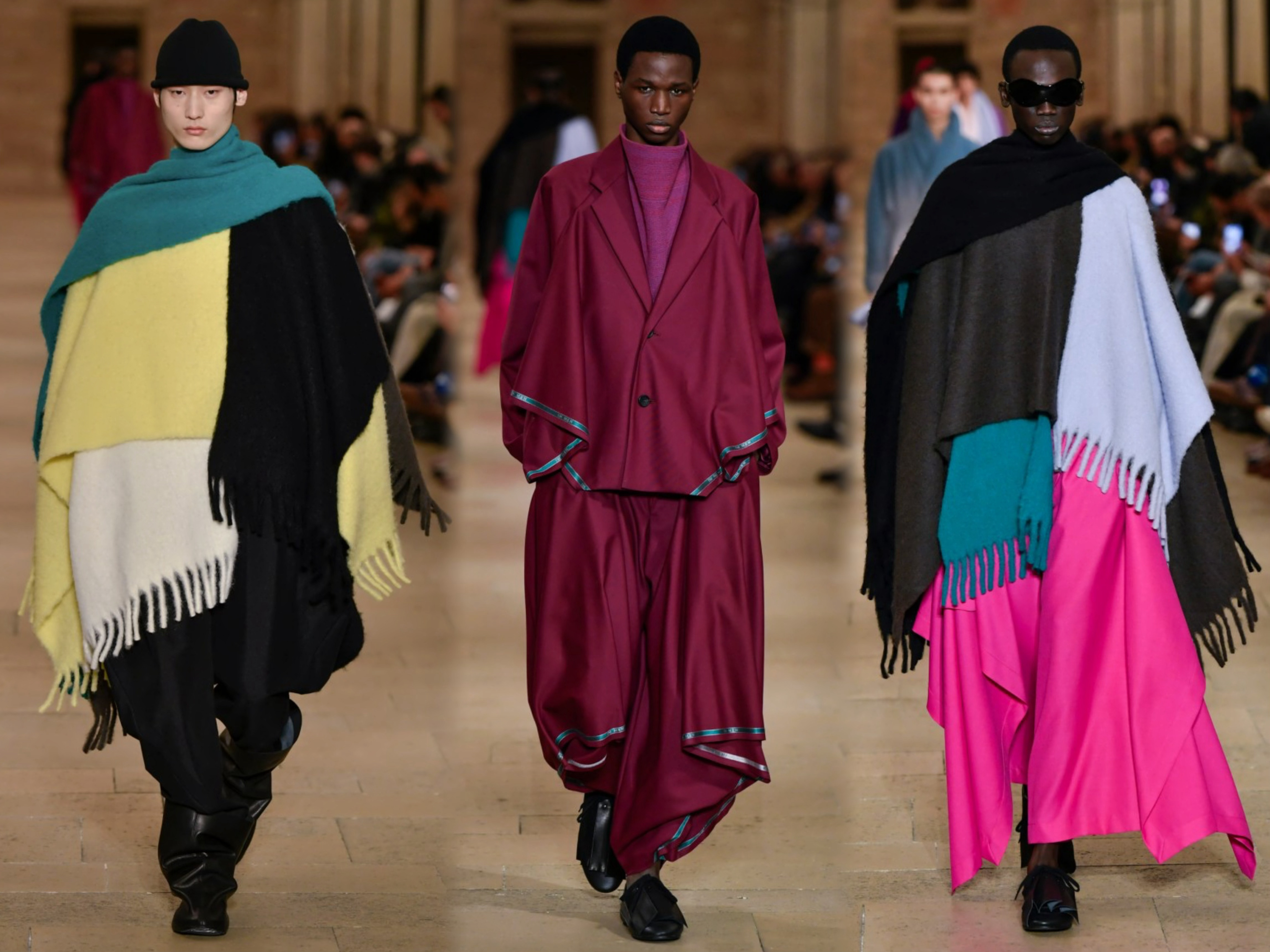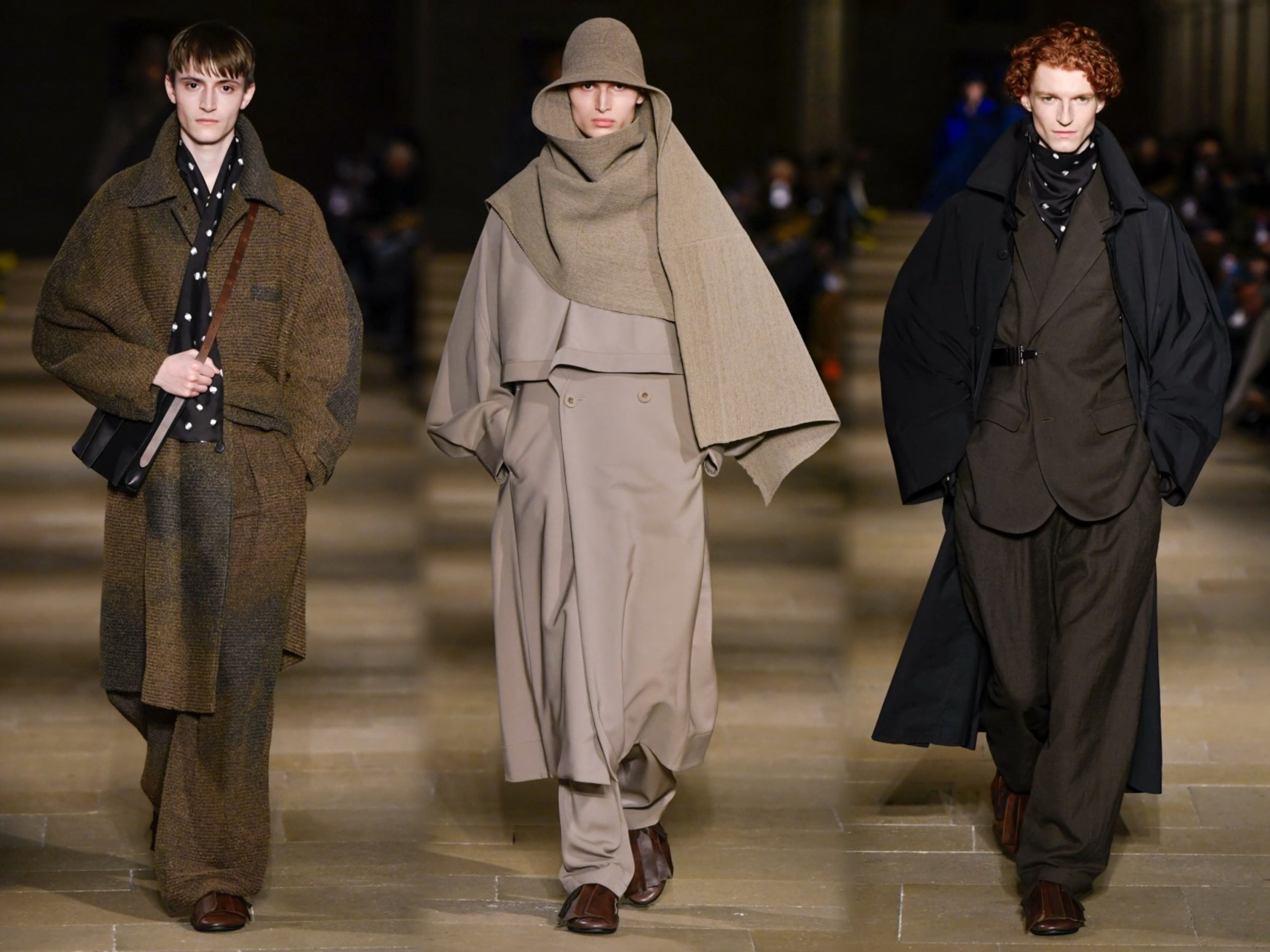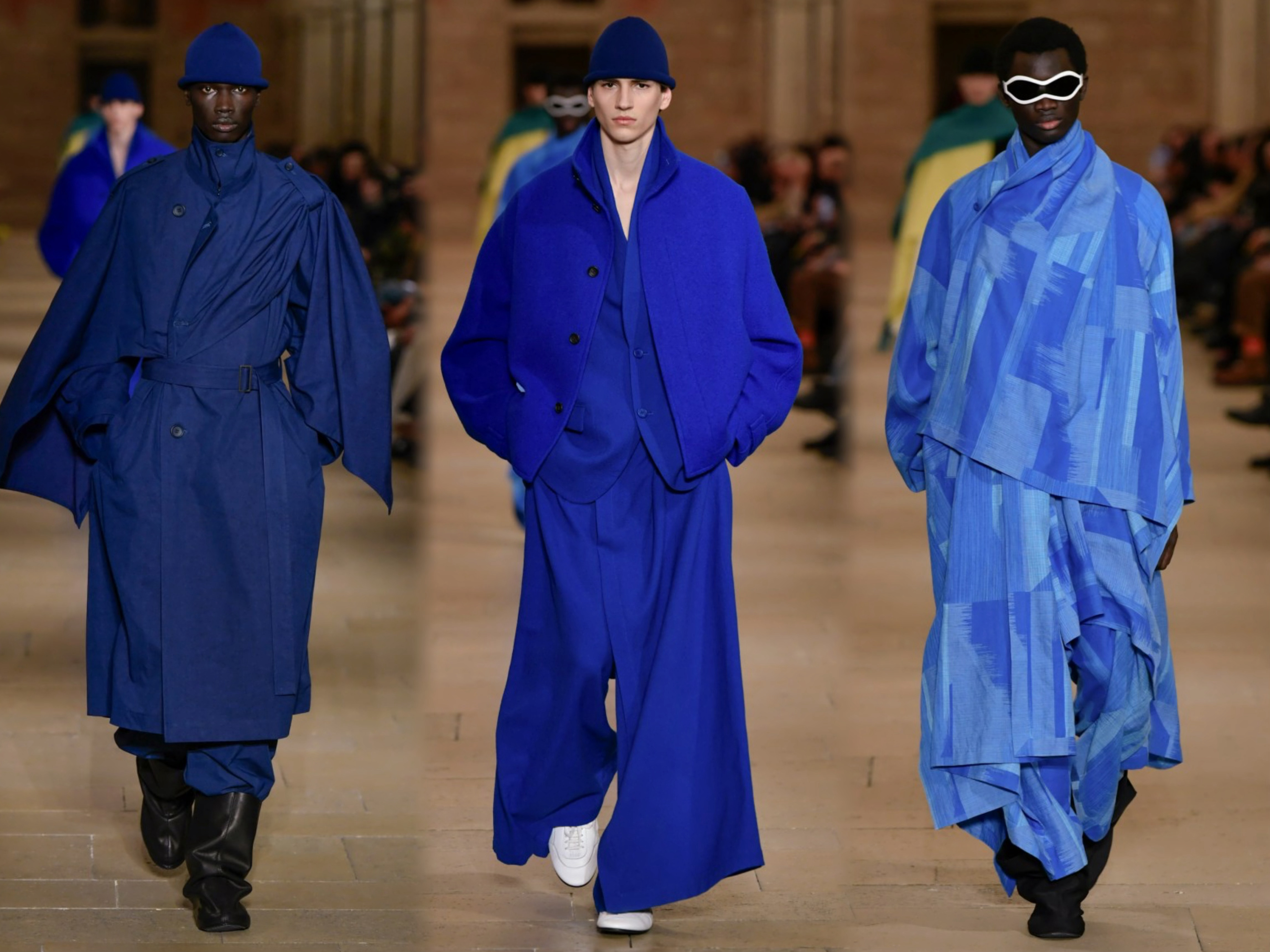 IM Issey Miyake Men Fall 2026 巴黎男装周 三宅一生秋冬男装以"无形之形"(Formless Form)为主题,延续极简廓形与褶皱工艺,通过层叠布料和流畅剪裁探索"流动与固定"的边界。深色系开场过渡到浅蓝、陶艺纹理的渐变色调,隐喻精神澄澈的过程,静谧诗意的东方冥想。男装周
